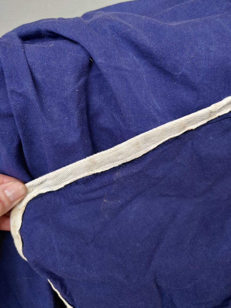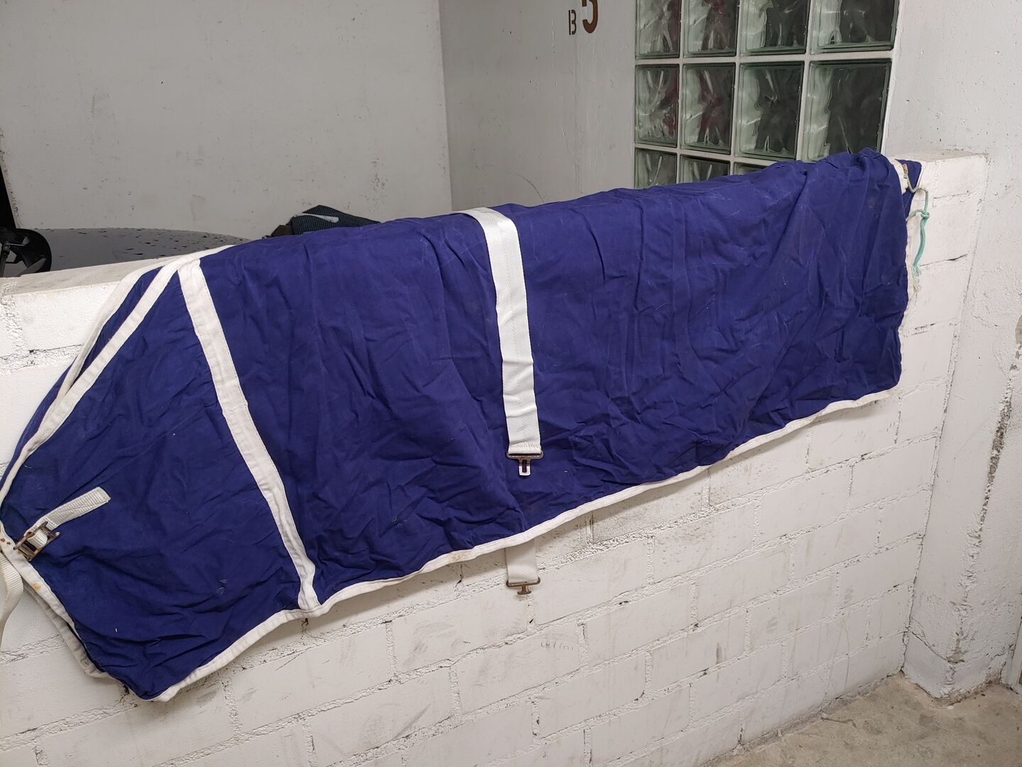 Dywanik stajenny / prześcieradło wystawowe rozmiar 115 - Cienka derka stajenna w rozmiarze 115 dla kuców. Do ochrony przed plamami z obornika, np. przed pokazem. Lekki, cienki materiał do użytku latem. Lub jako derka pod siodło, gdy robi się chłodniej. W dobrym stanie, wyprana, jedynie kilka plam na białym obszyciu nie zeszło całkowicie. Derka posiada zapięcie z przodu na klatce piersiowej oraz dodatkowy pasek na brzuchu. Klamra jest lekko zardzewiała, ale jest tylko wizualnie irytująca, klamra działa.