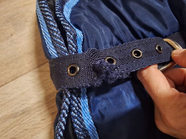Jak widać na zdjęciach, dywan jest lekko rozdarty na jednej przedniej klamrze i ma rdzawe przebarwienia od wewnątrz. Dlatego nie jest tak dobry jak nowy.