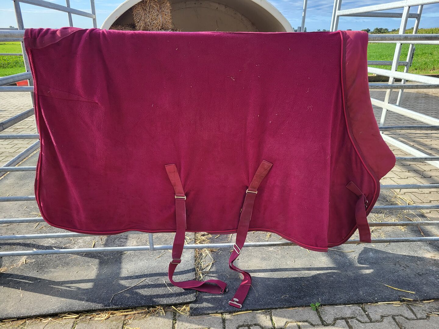Dywanik jest bordowo-czerwony i ma błyszczący napis "Waldhausen". Ma również metalowe zapięcie z przodu na rzep i krzyżowe klamry na brzuchu. Jest też ładny gruby kołnierz, który sprawia, że wygląda elegancko.