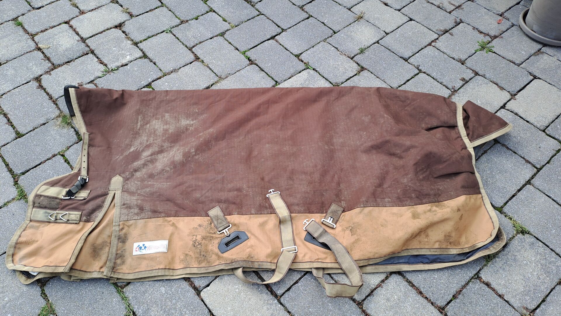 Dywanik zewnętrzny, 300gr, 4 konie, 125 - Noszone i nie prane, bez dziur! Brakuje karabińczyka na piersi.