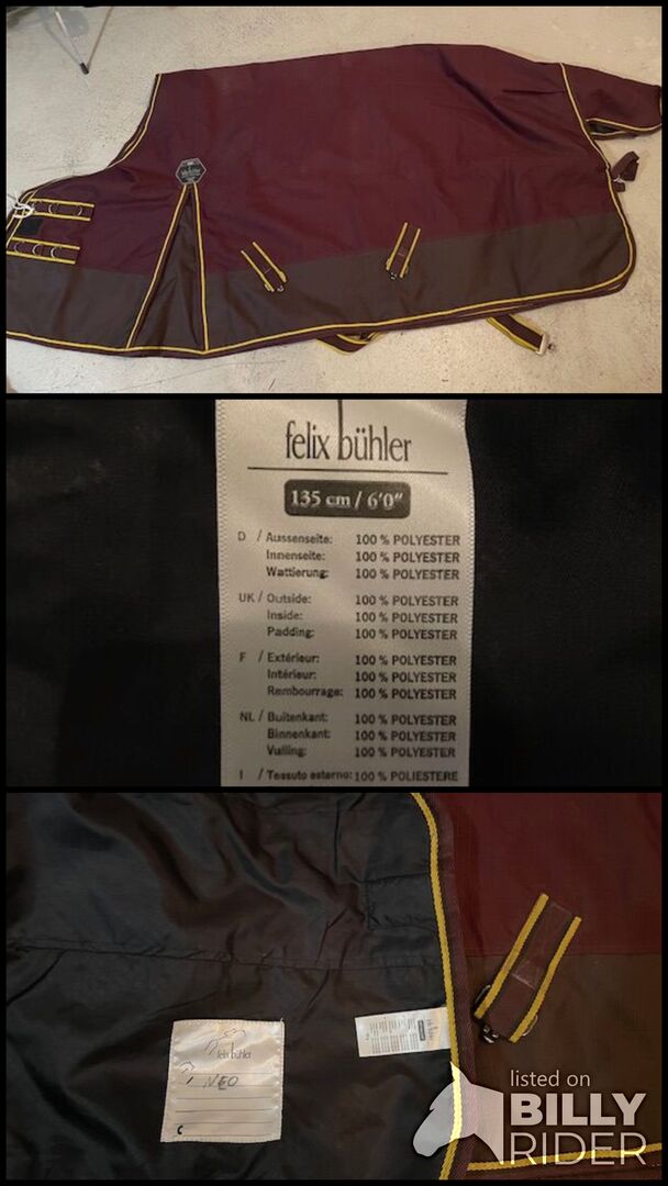 Dywanik zewnętrzny Generously (Felix Bühler) 50g 135 cm - Dwukolorowy, wytrzymały, wodoodporny i oddychający dywanik outdoorowy (słup wody 3000 mm, 1200 den), podwójne, regulowane zapięcie na piersi z karabińczykiem i dodatkowym zapięciem na rzep, wysoki klin. W komplecie sznurki na nogi. Mało noszone, niestety mój koń niedługo potem odszedł za tęczowy most. Miał typowy rozmiar 130, co jest rzadkością, derka pasowała na niego idealnie. Wyprana i nieprzemakalna.