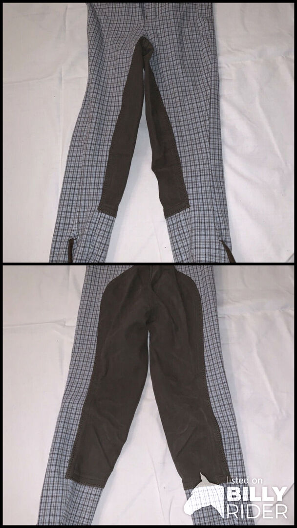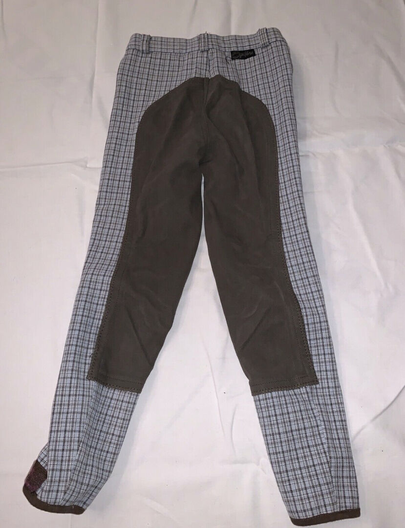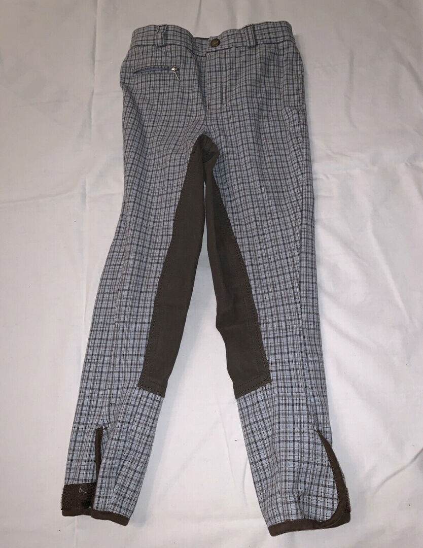 Dziecięce bryczesy jeździeckie Equilibre w kratkę, rozmiar 128 - Bryczesy dziecięce Equilibre w kratkę, jasnoniebiesko-brązowe, rozmiar 128 do sprzedania.