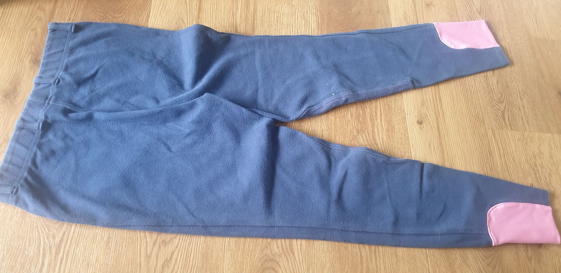 Dziecięce legginsy jeździeckie - Dziecięce legginsy jeździeckie w kolorze niebieskim/różowym. Rozmiar 152, w bardzo dobrym stanie. Z różowym wzorem podkowy na wewnętrznej stronie ud i różowymi akcentami na końcach nogawek spodni. Koszt wysyłki 5,00€