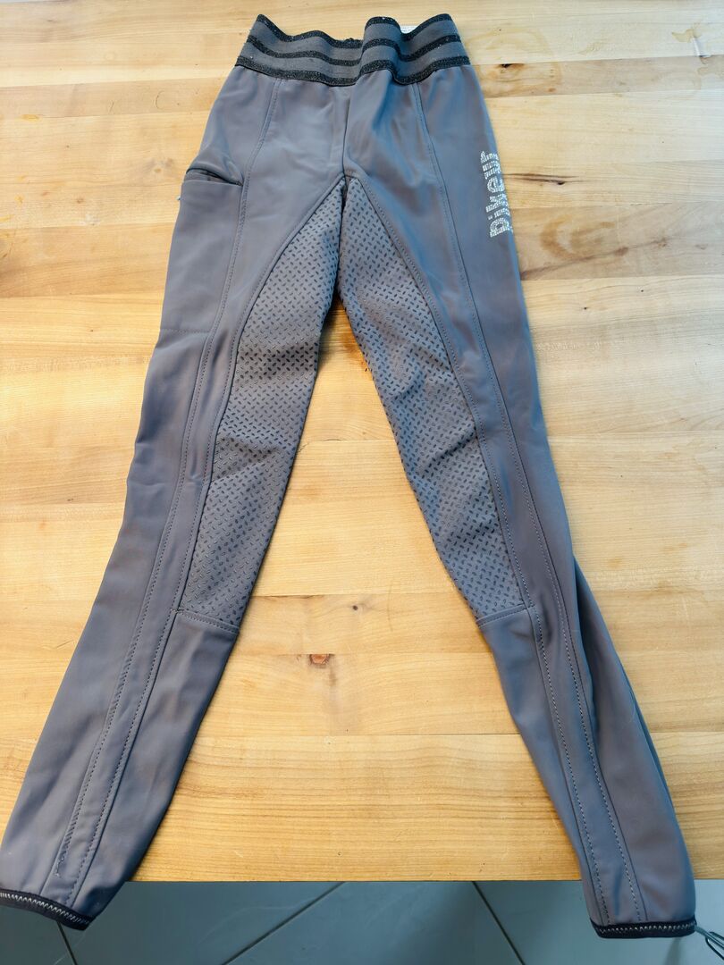 Dziecięce legginsy jeździeckie Ida Athleisure, pełne siedzisko, pełny chwyt, antracytowe - Rozmiar 146, krój skinny wąski krój i dłuższe nogawki zapinana na zamek kieszeń na telefon komórkowy po prawej stronie Uchwyt jest w idealnym stanie, brakuje kilku kamieni z logo, ale nadal bardzo dobrze się błyszczy