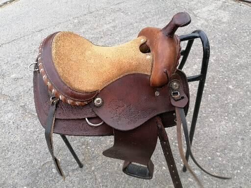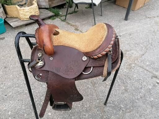 Dziecko/ Kucyk/Sztuczne Zachodnie Siodło - Sprzedaję dziecięce, kucyki, siodło z kamizelki Shetty w dobrym stanie z pięknymi zdobieniami (patrz zdjęcia). Nie mogę podać więcej szczegółów, ponieważ nie znalazłem nic na temat siodełka. Ponieważ jesteśmy klasyczną angielską szkołą jazdy konnej dla dzieci, nie potrzebujemy tego siodła. Nadaje się również do jazdy na kucyku lub do cyrku.