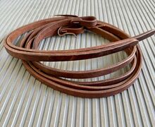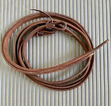 Dzielone lejce westernowe / dzielone lejce wykonane ze skóry uprzęży - Dzielone lejce western wykonane ze skóry uprzęży. Dla jeźdźców preferujących szersze lejce. Wymiary: 2,40 m długości x 1,9 cm szerokości x ok. 6 mm grubości z grubszym końcem Raz je naoliwiłem (w wyniku tego sznurki pociemniały), ale ich nie używałem.