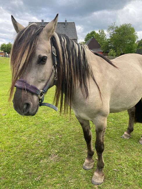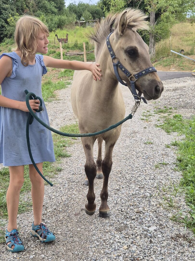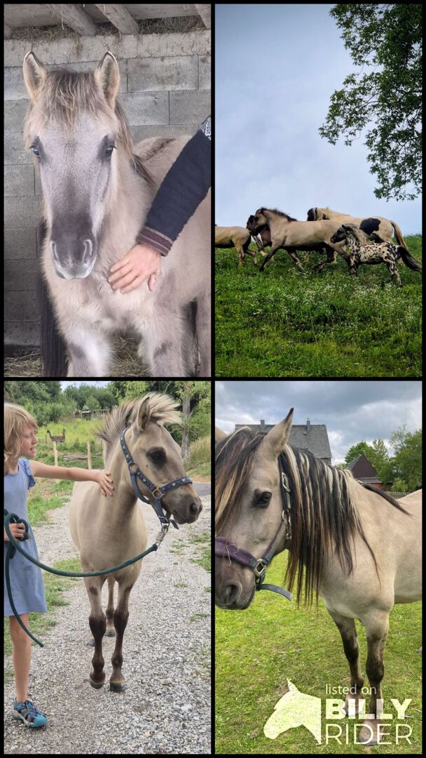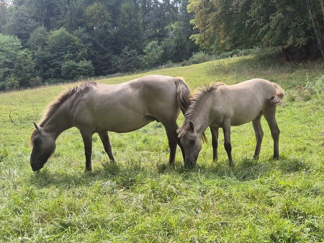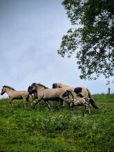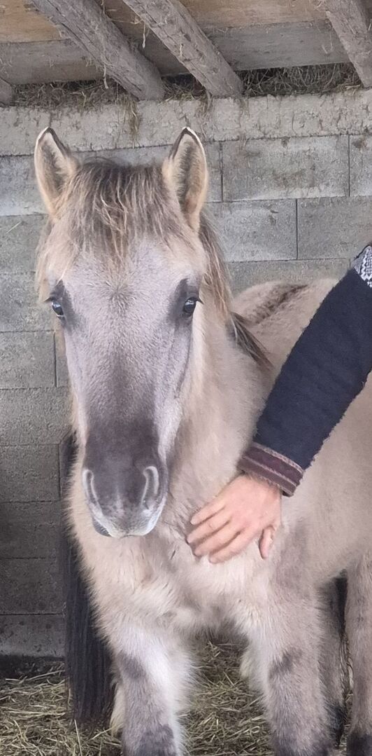 Dziki koń rasy Liebenthaler, roczny siwy dun Grullo - Na sprzedaż jest Milli, klacz Liebenthal z typowymi oznaczeniami dzikich koni. Milli urodziła się 30.3.25. Dorasta w stadzie i na wolnym wybiegu na pastwiskach bogatych w zioła. Jest odważna, a jednocześnie zrelaksowana (już przycinałam jej kopyta Flexem). Będzie kucykiem, który przetrwa wszystko ze swoją ulubioną osobą. Z pewnością może być używana jako koń terapeutyczny, do przejażdżek po szlakach lub gier jeździeckich. Szacuje się, że ma około 1,42. Tylko w towarzystwie koni i dla kupujących z doświadczeniem z młodymi końmi lub zapewnieniem miejsca do treningu. Młode konie nie powinny być w rękach dzieci lub amatorów! Więcej i nowsze zdjęcia i filmy na życzenie. Na zdjęciach portret jest jej ojcem, zdjęcia są z zeszłego lata i jesieni, pierwsze z grudnia.