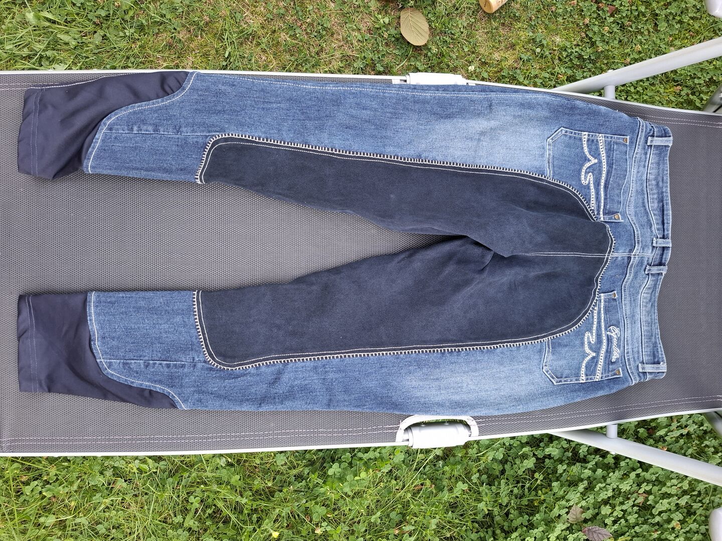 Dżinsowe bryczesy jeździeckie rozmiar 42 - Sprzedaję moje jeansowe bryczesy od Equilibre. Są noszone, ale w dobrym stanie. Lekkie pilling na wykończeniu, patrz zdjęcia. Wszystkie szwy są nienaruszone, nie ma wad na dżinsie i elastycznych mankietach przy kostkach. Materiał: 98% bawełna, 2% elastan Wysokość w pasie: środek talii.