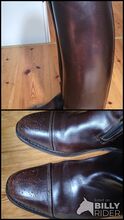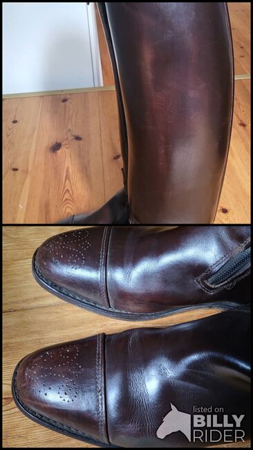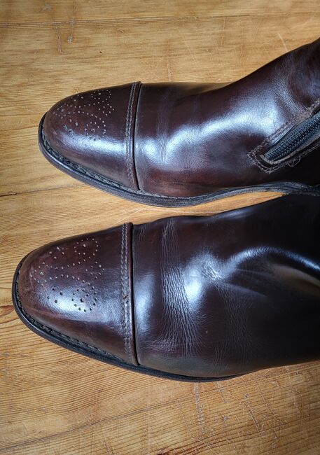 Ekskluzywne spersonalizowane buty KÖNIGS w kolorze ciemnobrązowym - Mod. SIR - - Oferuję parę spersonalizowanych butów znanej firmy KÖNIGS. Model SIR ma sztywny trzonek zewnętrzny i jest miękki od wewnątrz, oczywiście na zewnątrz znajduje się również łuk ujeżdżeniowy. Boczny zamek błyskawiczny i zatrzask. Cechą szczególną butów jest nie tylko ciemnobrązowy kolor, ale także przyciągające wzrok sznurowadła, które są perforowane jak w butach budapeszteńskich.