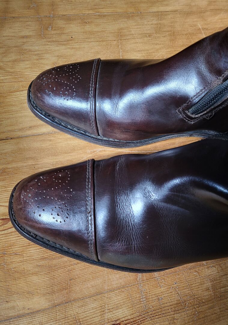 Wymiary: na zewnątrz, w tym łuk 57, od kolana do pięty 49 i szerokość przy zapiętym zamku 41 (przybliżone wymiary). Były noszone w rozmiarze 39-40.
