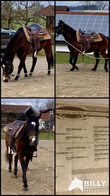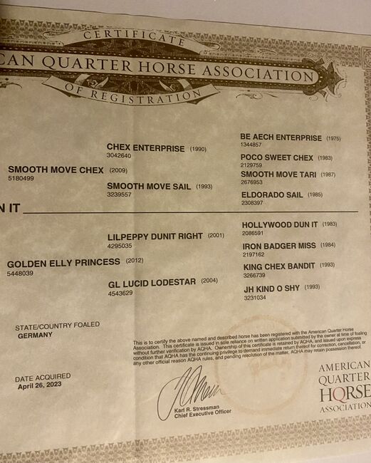 Ekspresyjny, piękny wałach rasy Quarterhorse - Na sprzedaż jest obiecujący wałach rasy American Quarter Horse, urodzony 26 kwietnia 2023 roku, Chex Barney Dun Zachwyca piękną głową, wspaniałym ciemnogniadym umaszczeniem i gigantycznym ruchem. Barney jest bardzo silny, niezwykle umięśniony z prawidłową podstawą. Ma bardzo długą, gęstą grzywę. Absolutnie proste nogi i bardzo duże, dobre kopyta. Wałach szczególnie nadaje się do dużego sportu reiningowego i już teraz wykazuje wiele talentu w tej dyscyplinie. Jest przyjazny w obsłudze, chętny do nauki i nadaje się zarówno dla ambitnych jeźdźców, jak i początkujących poszukujących niezawodnego partnera. Uwielbia spacery, pracę z ziemi, zna siodło i jest już świetny na lonży. Cena wzrasta wraz z dalszym treningiem! Barney ma rzadko spotykany rodowód. Matka bezpośrednio Lil Peppy Dun It Right córka/Hollywood Dun It. Barney jest wnukiem Chex Enterprise. Tylko dla najlepszych rąk, które docenią ten klejnot. Bez sprzedaży w trudnej sytuacji, zostanie sprzedany tylko wtedy, gdy wszystko będzie pasować!