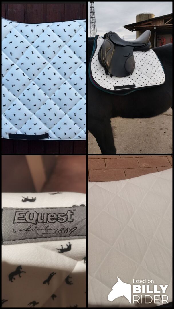 EQUEST Saddle Pad - VS/WB/Full - biały - Oferta pięknej i grubo wyściełanej podkładki pod siodło firmy EQUEST, spód w całości w kolorze białym. Rozmiar VS - WB / Full Kolor biały z małymi czarnymi konikami i sznurkiem w kolorze srebrnym.