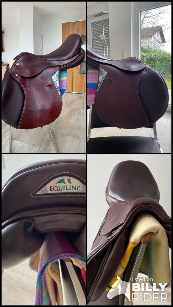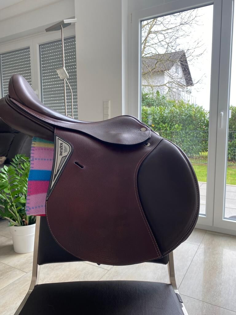 Equile Talent w siodle do skoków - Siodełko nie ma żadnych uszkodzeń i jest jak nowe ze względu na krótkie użytkowanie (pół roku). Rozmiar siedziska wynosi 17 cali, szerokość przełyku ok. 33 cm. Z przodu znajdują się panele z rzepami ułatwiające dopasowanie do nogi jeźdźca. Panele siodła są wyściełane wełną, dzięki czemu można je regulować. Dzięki półgłębokiemu siedzisku siodełko jest bardzo wygodne i zapewnia bardzo dobre podparcie.