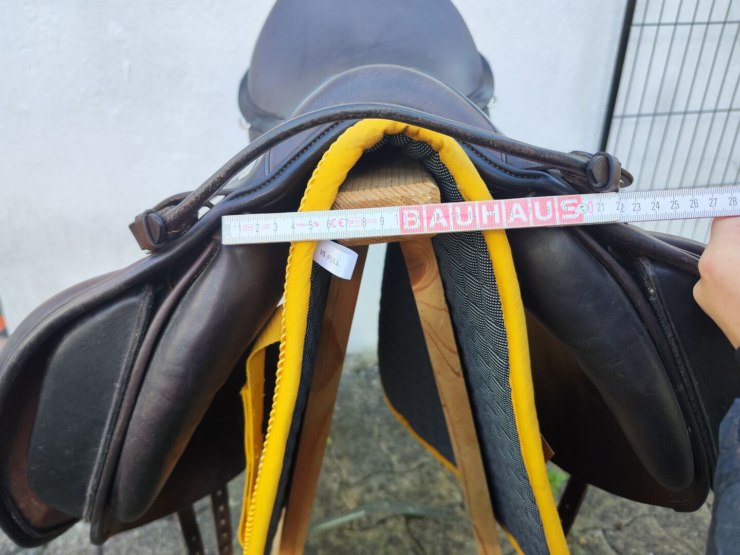 V-girthing, klamry do krótkiego obwodu Podkładki na rzepy. Francuskie panele bananowe, krótka powierzchnia styku (ok. 42/43cm) Bardzo duża szerokość komory, która może być oczywiście zmieniona przez rymarza. Mocowany na szerokim, krótkim Fribi z dość prostym grzbietem.