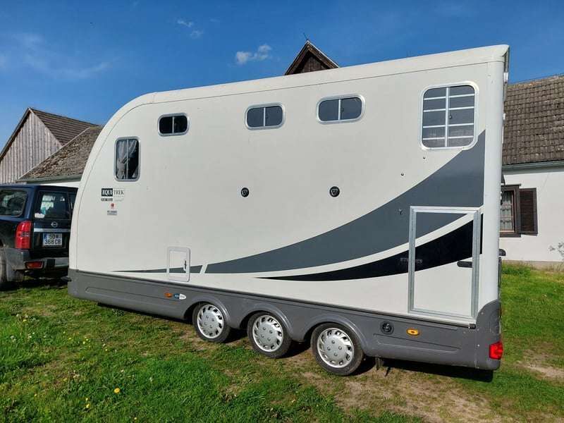 EQUITREK Star-Treka - Excel - Przyczepa do przewozu koni z przedziałem mieszkalnym - Z ciężkim sercem sprzedaję nową przyczepę EQUITREK Star-Treka w topowej wersji Excel z powodu emigracji, ponieważ niestety prawie jej już nie używamy. Przyczepa jest zawsze pod przykryciem. Homologacja ECE oznacza bezproblemową homologację w UE! Uzupełnienie do wersji Excel: Skórzane siedzenia Wersja z grupą siedzeń (podwójne łóżko) Powierzchnie "High Gloss" Nowa cena tej wersji to ponad 33000. Wyposażenie: Zewnętrzne: Aerodynamiczny przód z włókna szklanego Koło zapasowe i wspornik Ocynkowane stalowe podwozie Zamykane sprzęgło Niezależne zawieszenie Sześć w pełni hamowanych kół Zbudowany w fabryce ISO9001 Duży przedni schowek Dwa zewnętrzne pierścienie mocujące Część mieszkalna: Lodówka Elektryczna toaleta ze spłuczką Duże oświetlenie wewnętrzne z dodatkowymi reflektorami Trzy otwierane okna i świetlik dachowy Aneks kuchenny Obszar toalety Dopasowane zasłony Duże okno przednie Elektryczne zasilanie w wodę Akumulator rekreacyjny Lusterka Obszar dla koni: Jasne i przestronne wnętrze Wyściełany pałąk o pełnej szerokości Wytrzymałe kompozytowe deski do biegania Wytrzymałe aluminiowe płyty podłogowe Antypoślizgowa gumowa rampa Dwa uchwyty na siodło i dwa uchwyty na uzdy Panele kompozytowe Regulowana ścianka działowa z fartuchem PVC do podłogi Oddzielny obszar dla koni Dodatkowe okno wentylacyjne Przedział pielęgnacyjny z oświetleniem Pomieszczenie z oświetleniem Przegroda na głowę Białe, łatwe w czyszczeniu bezpieczne drzwi załadunkowe Tapicerka ścianki działowej Prysznic dla koni Dwa uwiązy dla koni i siatka na siano Pięć otwieranych okien ze świetlikiem i wentylacją dachową Oświetlenie wewnętrzne Kamera monitorująca Zacisk koła (urządzenie antykradzieżowe) Dodatkowe światła tylne