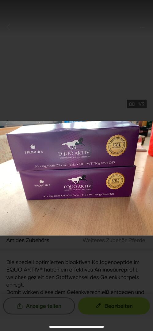 Equo Active - 54 porcje do oddania z powodu utraty konia Specjalnie zoptymalizowane bioaktywne peptydy kolagenowe w EQUO AKTIV® mają skuteczny profil aminokwasowy, który w szczególności stymuluje metabolizm chrząstki stawowej. Przeciwdziała to zużyciu stawów i wspomaga tworzenie nowej tkanki chrzęstnej. Cena za 60 saszetek wynosi 189 € na stronie internetowej