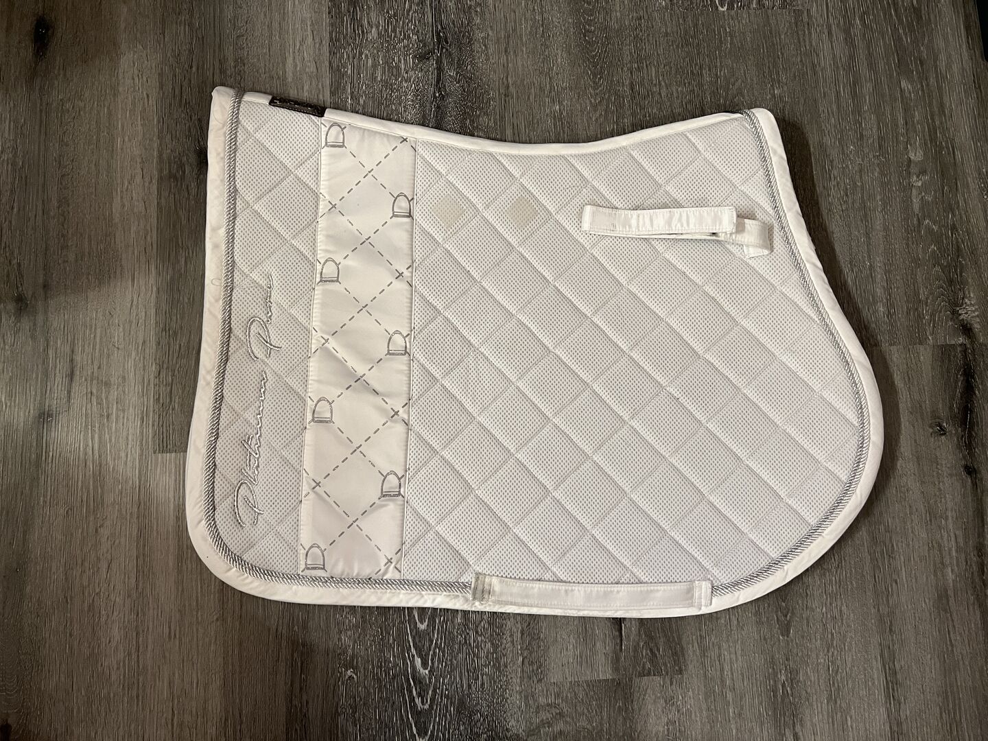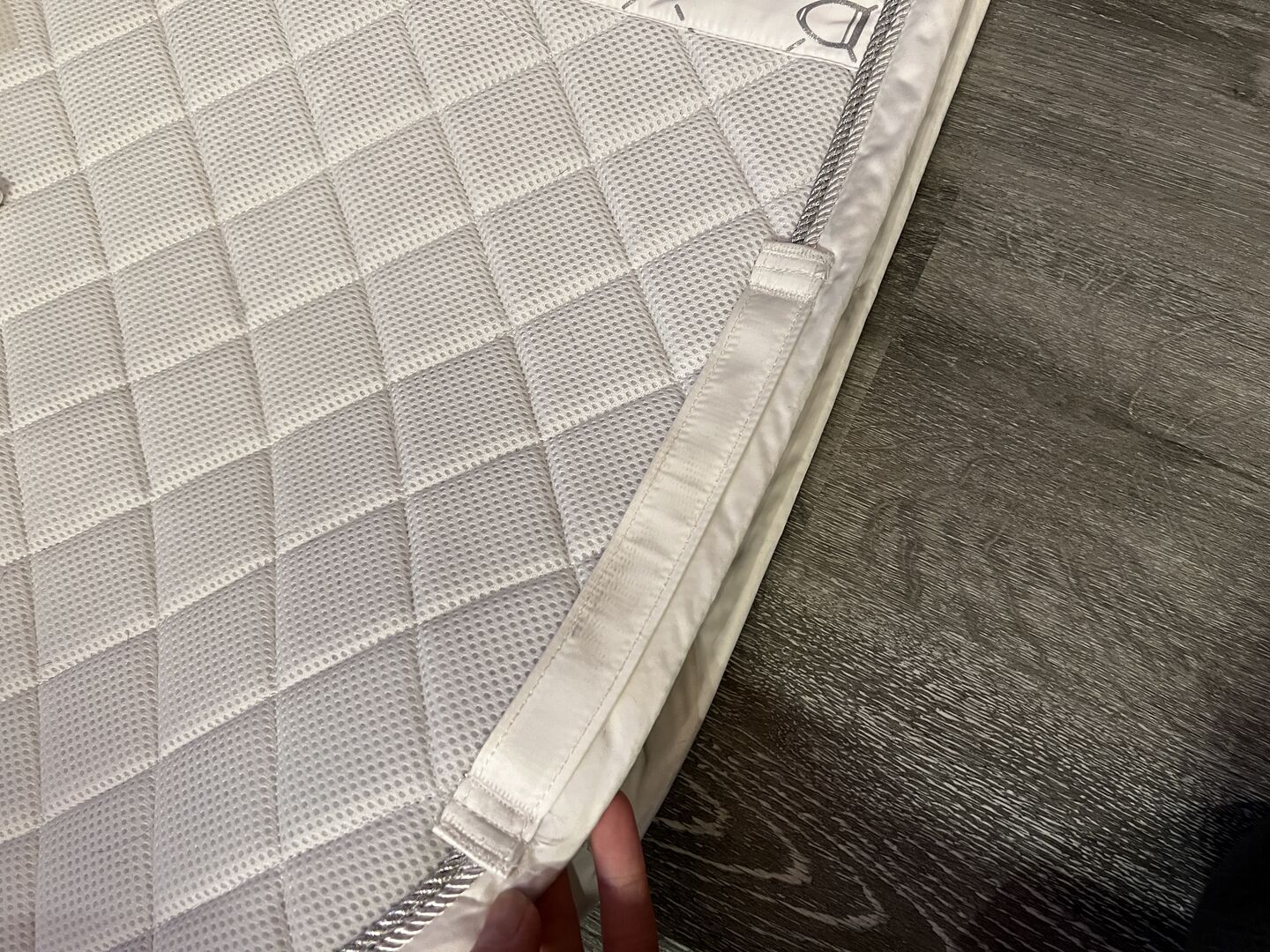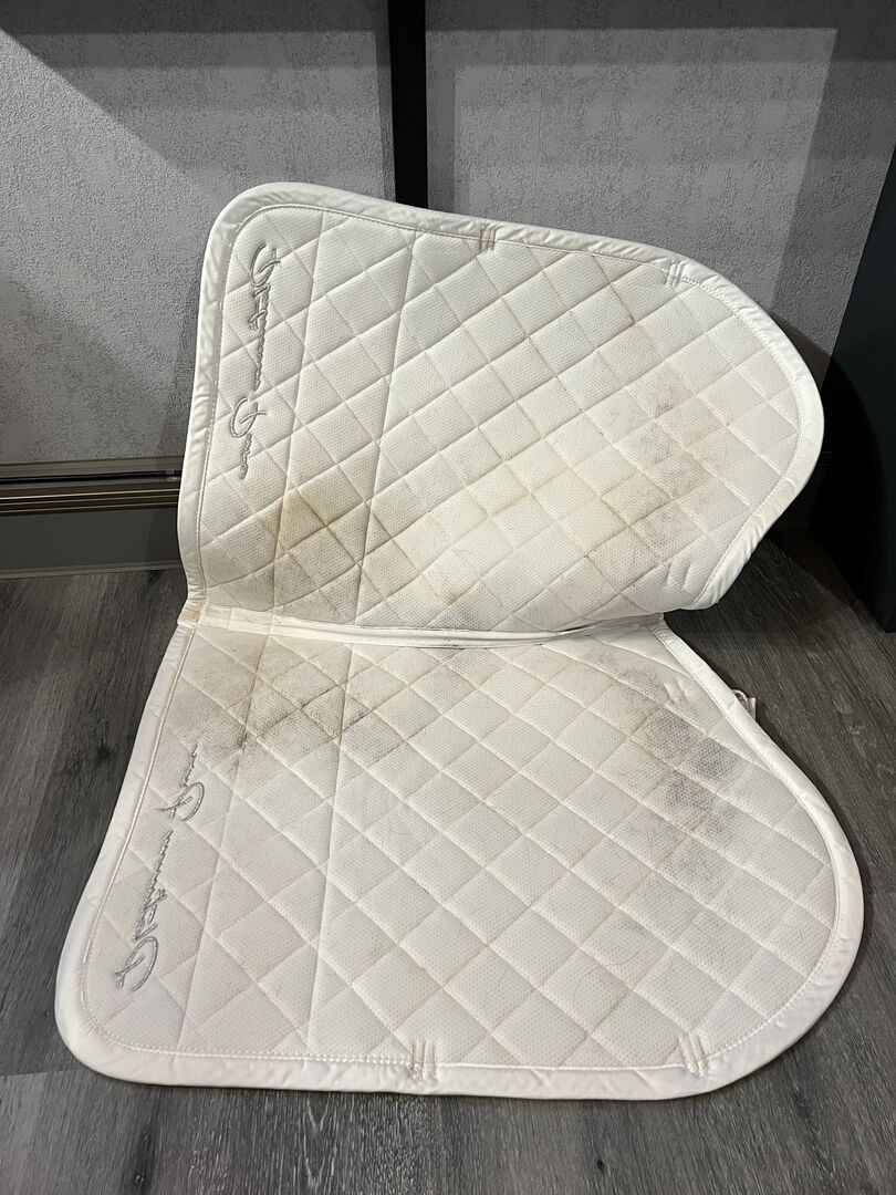 Eskadron Platinum Pure Mesh VS white - Sprzedam używaną, ale wciąż w dobrym stanie siodełko siatkowe firmy Eskadron z kolekcji Platinum Pure. Niestety podkładka ma lekkie plamy na siodle na pasie, ale nie wiem czy da się je ponownie wydobyć. Nie przeszkadzają one jednak wizualnie, gdy siodło jest założone. W pozostałych przypadkach podkładka pod siodło jest świeżo wyczyszczona. Niestety, na spodzie jest jeszcze trochę włosków i uporczywych przebarwień. Ale ponieważ jest on pod spodem, nie wpływa to na wygląd.