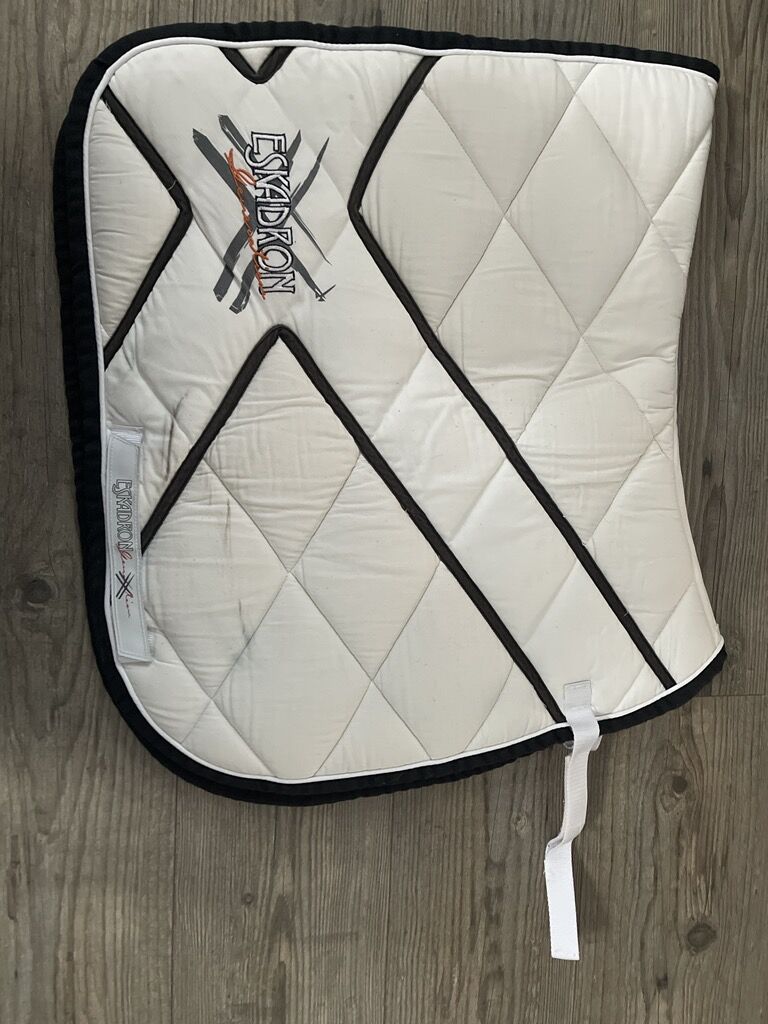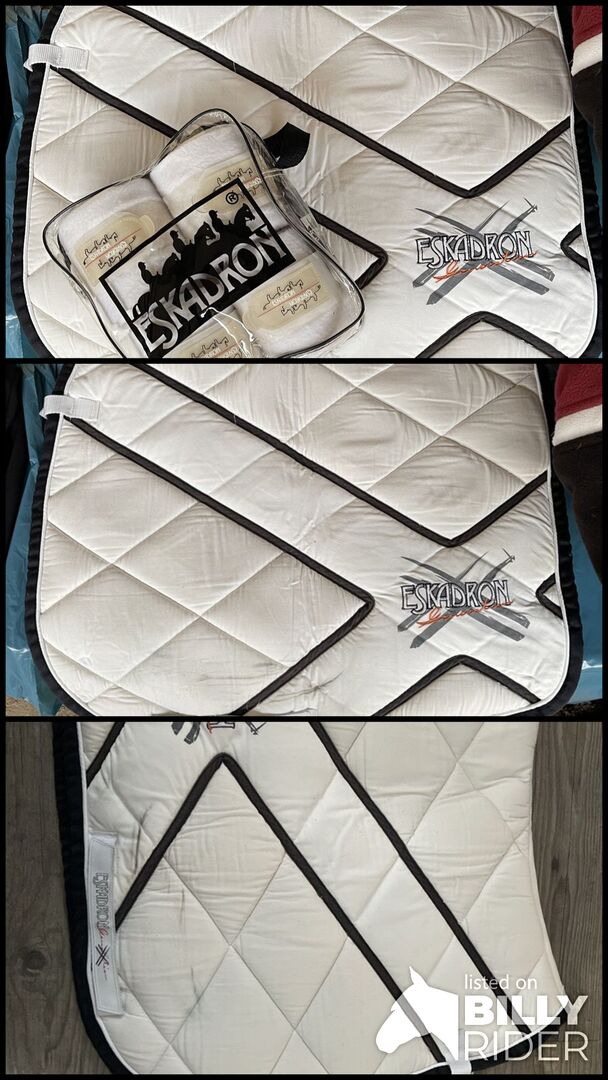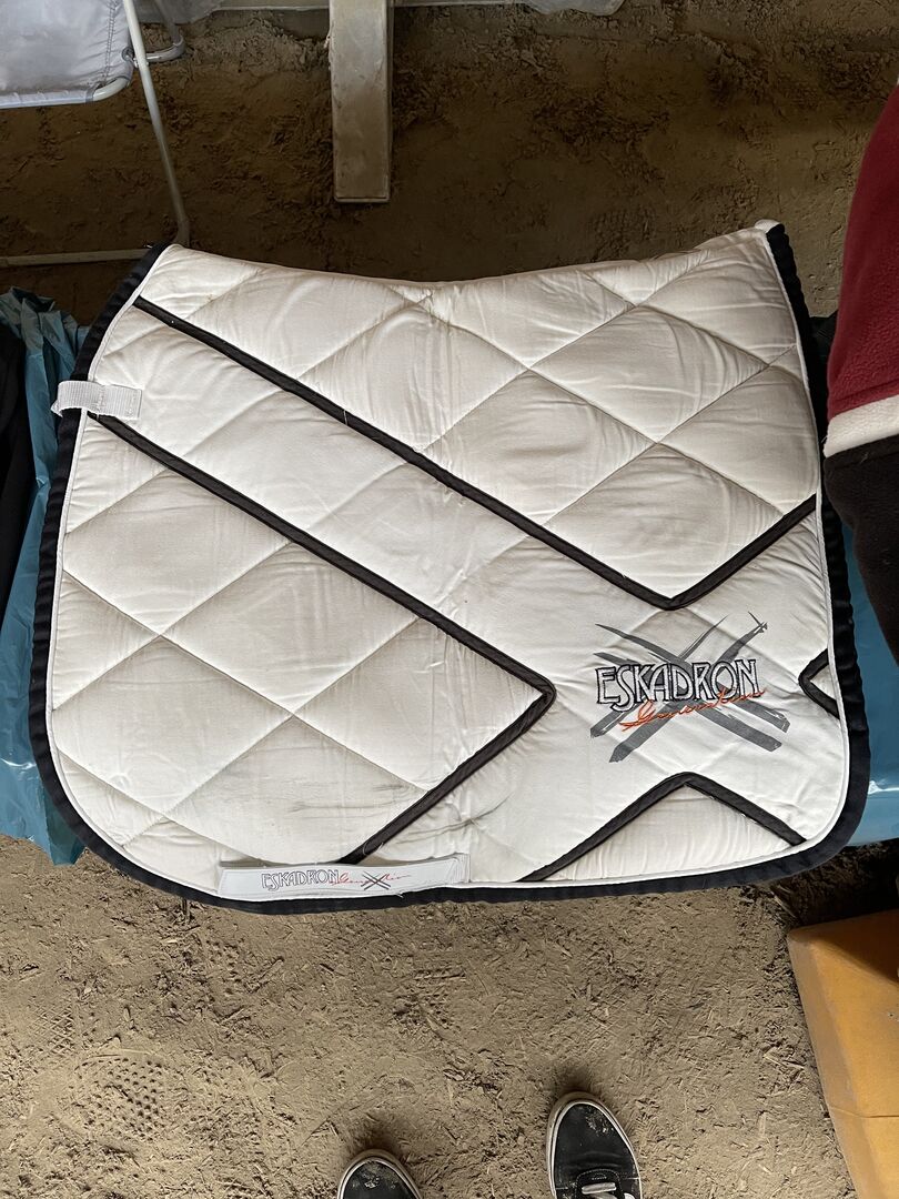 Eskadron Saddle Pad biały - Sprzedam podkładkę pod siodło Eskadron (pas nieco przebarwiony od siodła, patrz zdjęcie - nie widać pod siodłem) DL WB + bandaże WB w kolorze białym.