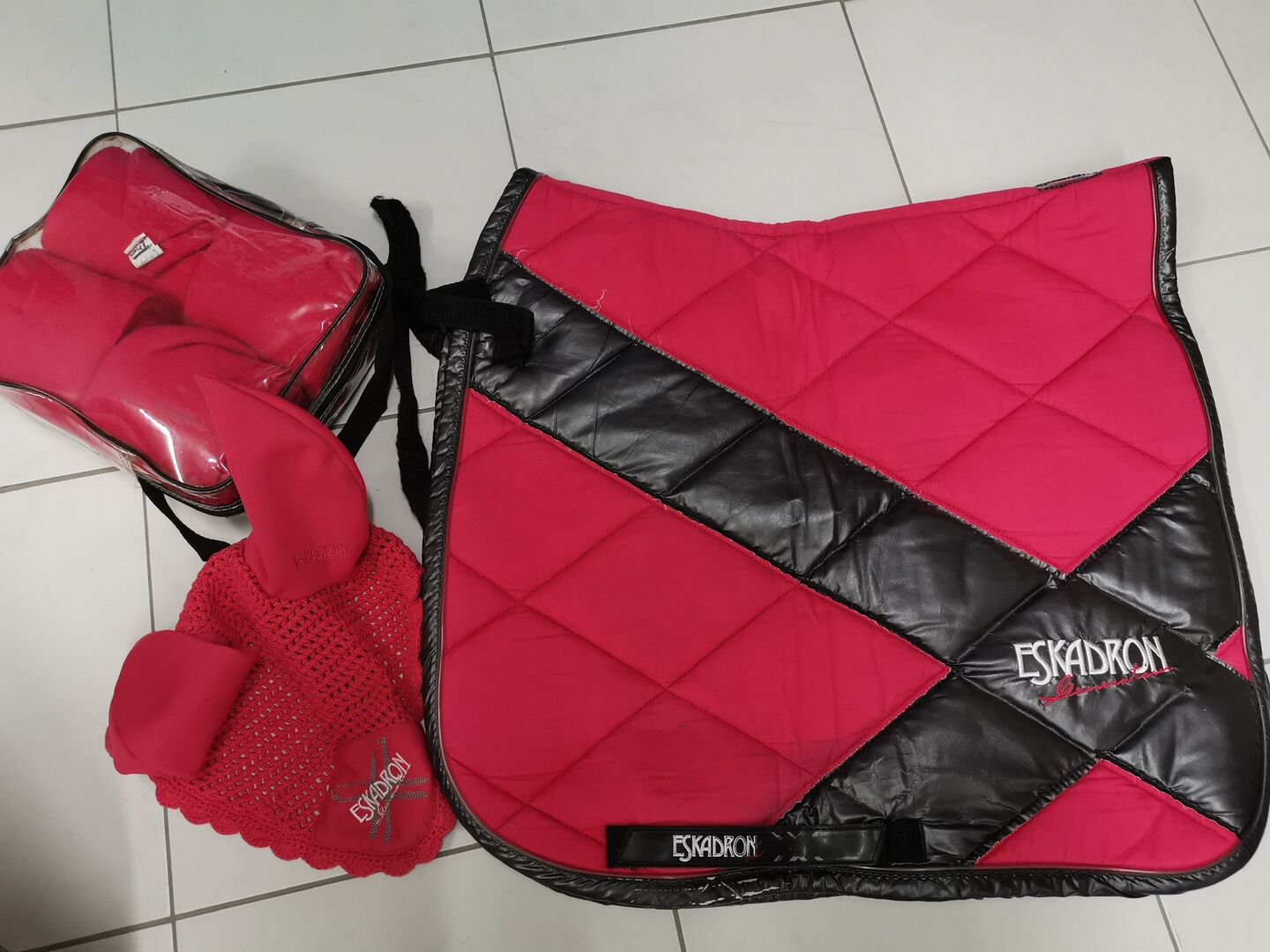 Eskadron Set WB Dressage - Zestaw Eskadron w kolorze malinowym Torba na skrobankę WB ujeżdżanie, osłona na uszy WB, bandaże WB Używane, ale bardzo zadbane