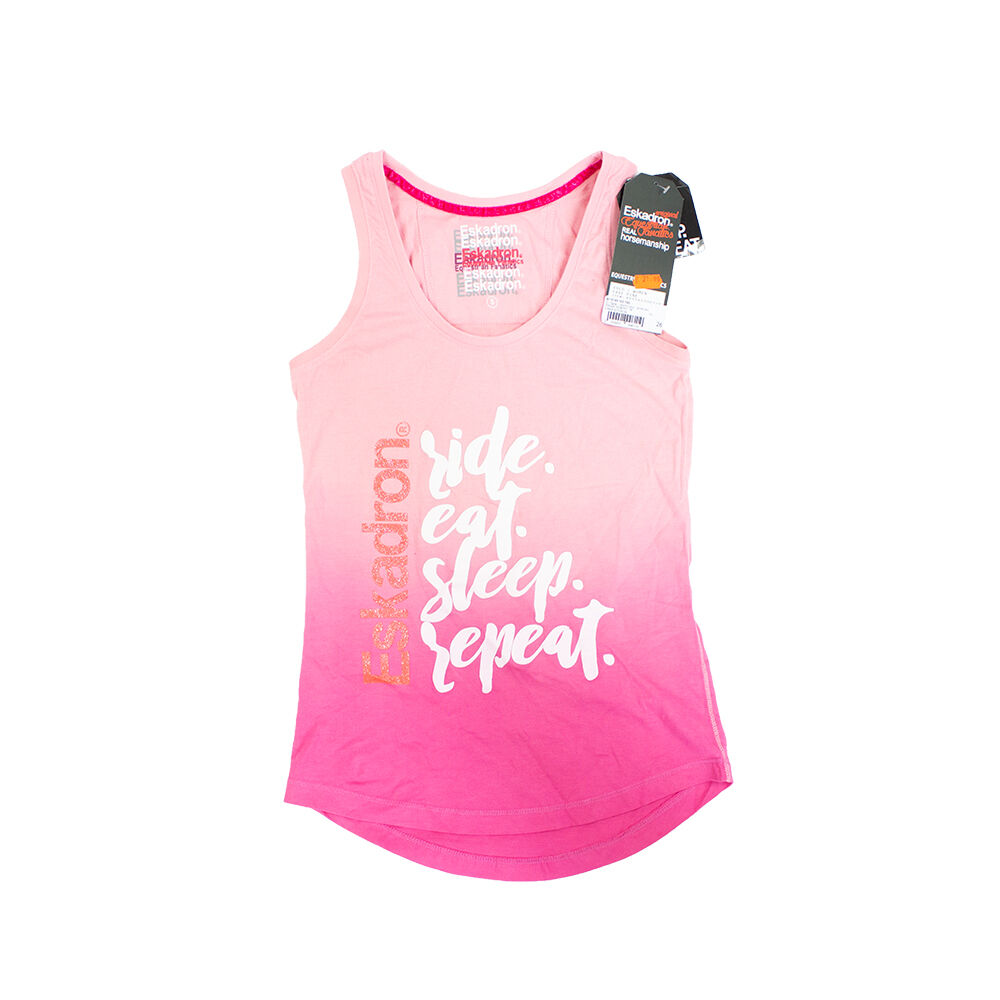 Eskadron Tank Top "Coco" Fade Pink S - Ten świetny damski tank top marki Eskadron z kolekcji wiosna/lato 2019 jest Twoim idealnym towarzyszem. Koszula z wielkim gradientem różu do różu zawsze się wyróżnia. Czy to do uprawiania sportu, jazdy konnej, czy do wypoczynku - topy od Eskadrona dzięki wysokiej jakości i wygodnym materiałom są idealne na każdy dzień. Na koszulce znajduje się duży napis ride.eat.sleep.repeat. napisy i wielkie logo Eskadronu jest wydrukowane w brokatowym napisie. Jest to rozmiar S. Koszula jest nowa z metką. To the seller's offerlaunch