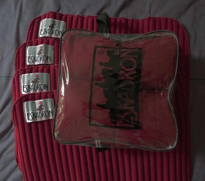 ESKADRON Zestaw Bandagen & Unterlagen Climatex weinrot burgund - Wegen Aufgabe des Reitsports muss in nächster Zeit so einiges raus: Schönes Eskadron-Set: Climatex Bandagierunterlagen (Maße: ca. 32 cm x 45 cm) + passende Fleecebandagen - allles für Warmblut. Fleecebandagen waren 2 x am Pferd, also neuertig, Unterlagen sind auch super, hatten einen Mini-mini-Cut, diesen habe ich erfolgreich ausgebessert, siehe Foto (2cm). Dazu gebe ich noch 2 weitere Fleecebandagen von Busse (Everline) mit dazu. Fast identischer Farbton ...także 4 x Eskadron, 2 x Busse. Ganz dunkles weinrot....