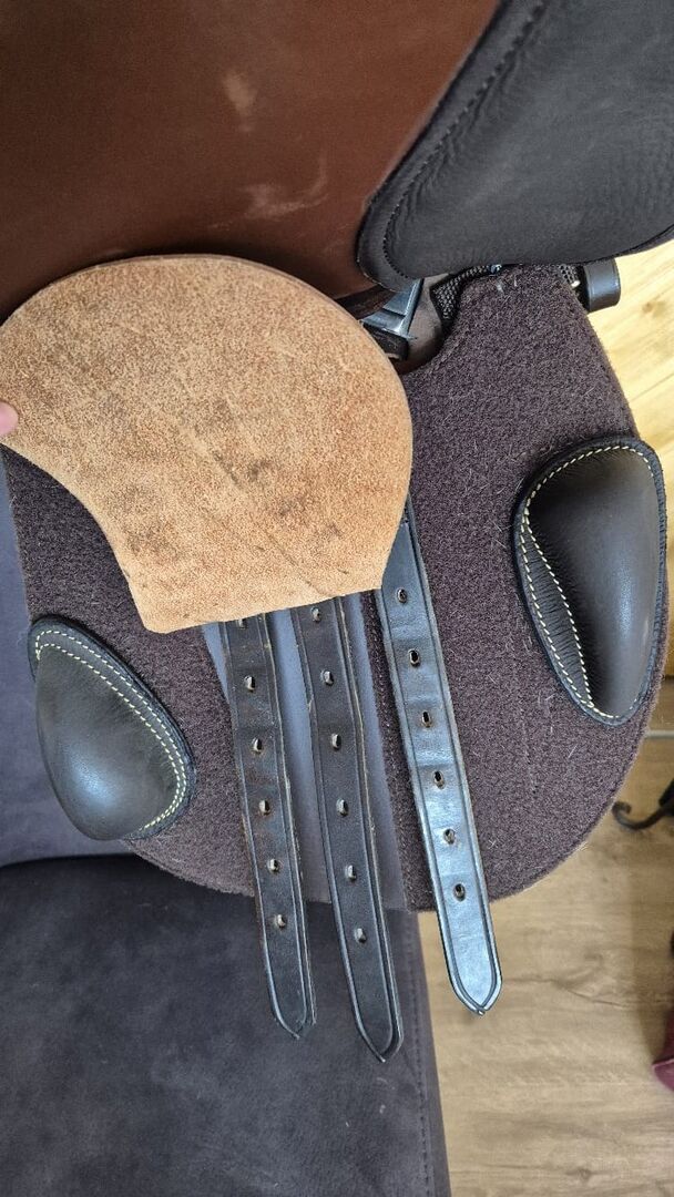 Szerokość komory: 31,5 (indywidualnie regulowana na zimno) Płyta wpustowa: WKE Kolor siodełka: mokka/koniak Rozmiar siedziska: 17,5 Drzewo: Flexus, siodełko z talią H7 Poduszka: Panele ochronne Okucia: Mosiądz Rolki kolanowe: rzepy z przodu i z tyłu Lamówki: złote Szwy: złote