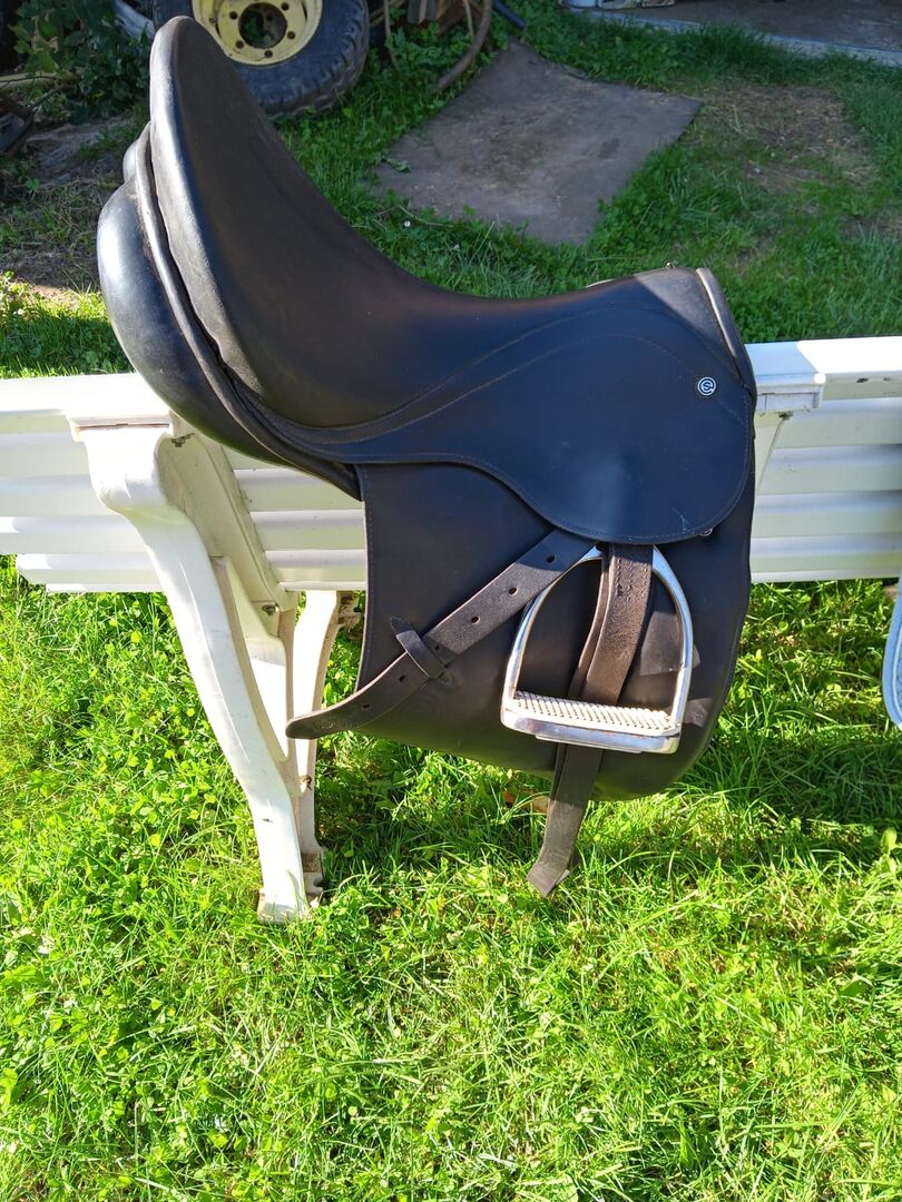 Specjalnie skonstruowane tak, aby dzieci mogły samodzielnie je opasać Pasuje na kuca Haffi lub mniejsze konie 1,25 cm lub ostateczny rozmiar kuca Miałem na nim moją klacz hanowerską, która zmarła, dlatego jest sprzedawana. Pasuje również na Tinkera lub inne konie. Jest również miły i przytulny w terenie na dłuższe przejażdżki.