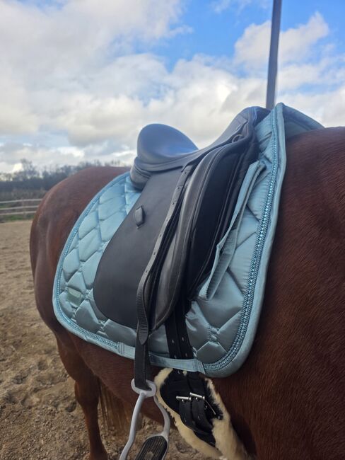 Euroriding Achat siodło ujeżdżeniowe z akcesoriami - Doświadcz maksymalnej przyjemności z jazdy dzięki siodłu ujeżdżeniowemu ACHAT od Euroriding, syntezie komfortu i stylu. To eleganckie siodło w klasycznej czerni i rozmiarze 17 cali oferuje idealne dopasowanie dla Ciebie i Twojego konia dzięki średniej szerokości komory. Wykonane z wysokiej jakości skóry, łączy trwałość z atrakcyjnym wyglądem, który sprawia, że każda jazda jest wyjątkowym doświadczeniem. Idealne dla ambitnych jeźdźców, którzy cenią jakość i harmonijną relację z koniem.