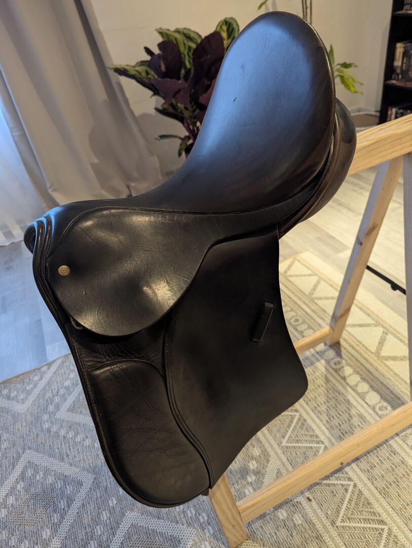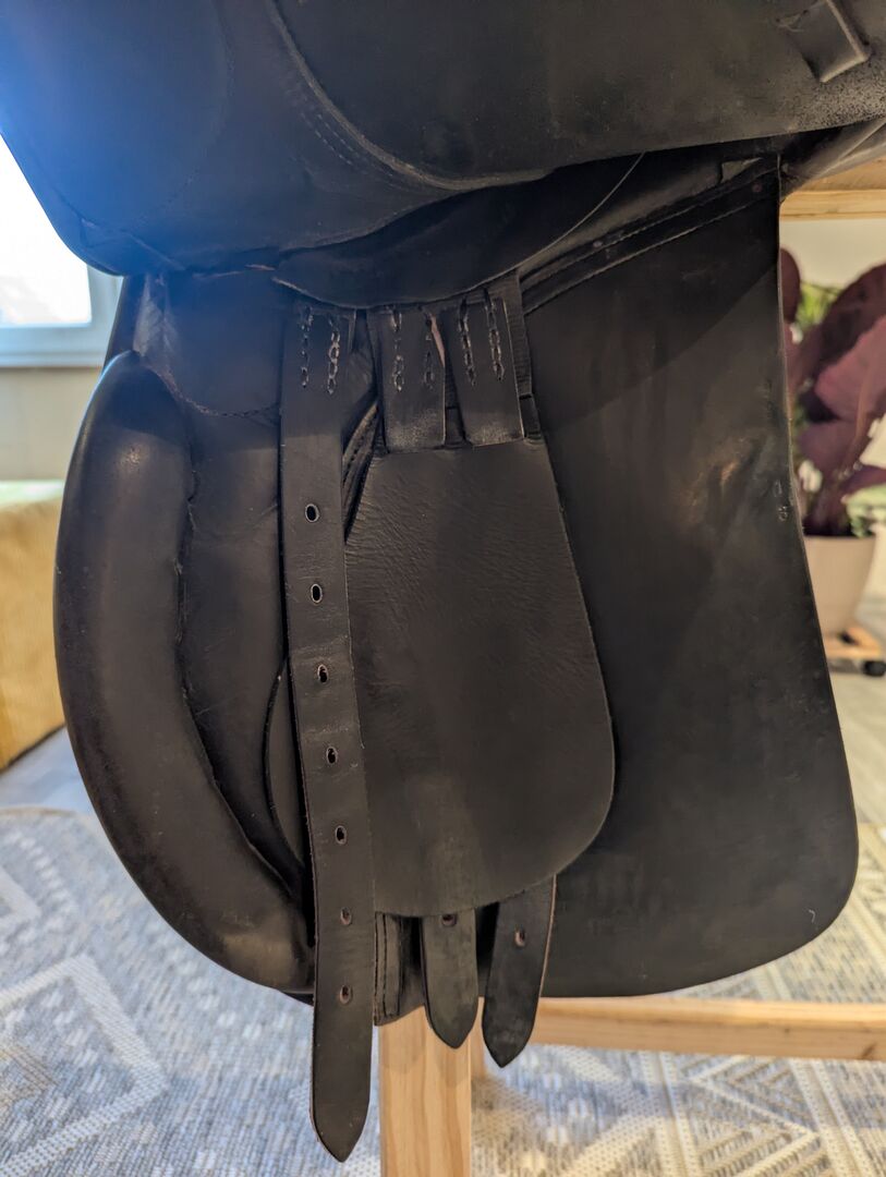 Jest używane i dlatego wykazuje kilka oznak zużycia, ale nadal jest w dobrym stanie. Nie było na koniu w ciągu ostatnich kilku lat, a ponieważ przeszedłem na jazdę westernową, nie jest już dla mnie użyteczne.