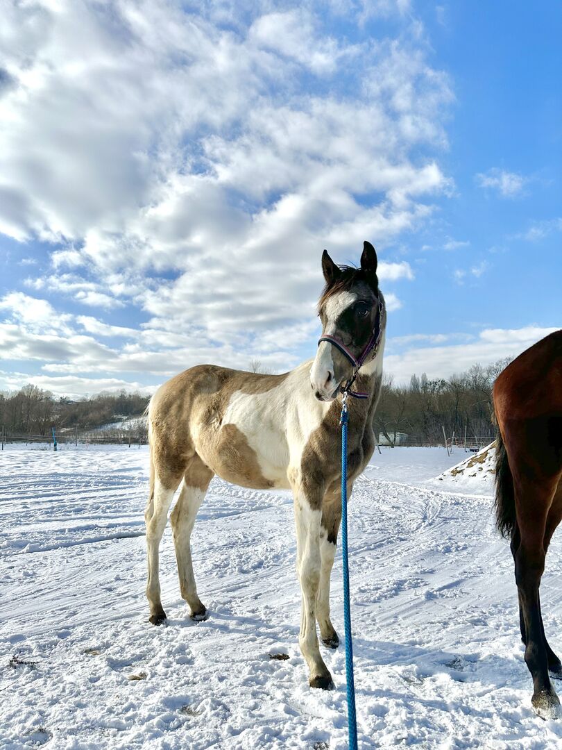 He stands out with a rare and eye-catching buckskin pinto coat. In summer, his coat develops a characteristic golden metallic sheen, especially visible in sunlight – a typical trait of Akhal-Teke horses, clearly inherited from his sire.