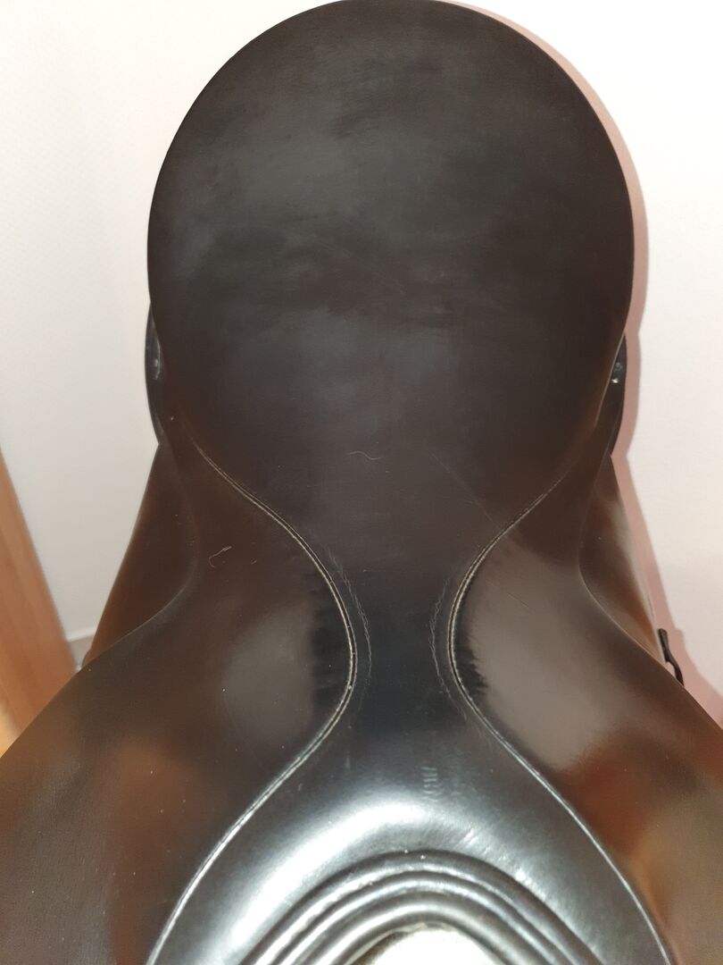 F. Siodło ujeżdżeniowe Weischenberg - Witam wszystkich, Oferuję na sprzedaż używane siodło ujeżdżeniowe Weischenberg. Siodło kupiłam sama w takim stanie, założyłam na konia na krótko, zdałam sobie sprawę, że nie pasuje i jest dalekie od dopasowania, po czym trafiło na strych, dobrze zapakowane. Teraz robię porządki, mam je znowu w rękach i chciałabym je sprzedać. Siodło nie ma rozmiaru. Od środka gwoździa siodła po przekątnej do środka łęku ma około 44,5 cm, czyli równowartość 17,5 cala. Nie wiem, jakie prace były przeprowadzane na siodle w przeszłości, ani nie mogę zajrzeć do środka. Wizualnie robi dobre wrażenie, czarna skóra jest zadbana, bez dziur, pęknięć czy większych śladów poza jednym na lewej klapie siodła, patrz zdjęcie. Moim zdaniem ma dość dużo wełny wyściełającej, a wyściółka nie jest nierówna. Kanał kręgowy jest dość szeroki. Komora powinna być średnia. Jednak ktoś skrócił struny, zanim go kupiłem. Nie mam pojęcia dlaczego.... Aby zrobić miejsce, sprzedaję go w korzystnej cenie, jak opisano powyżej.