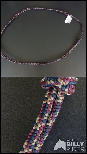 Fajna obroża na szyję dla koni - wyprodukowana w USA. Kolor bordowy/niebieski/juta - Obróżka na szyję dla jeźdźców rekreacyjnych, Western & Liberty Wysokiej jakości obróżka na szyję w rozmiarze warmblood-coldblood szukająca nowej sfery aktywności. Minimalne ustawienie 170 cm Idealna dla tych, którzy cenią sobie dobrą jazdę, zaufanie i komunikację. Wykonana ręcznie w USA Stosunkowo mocna lina w oplocie diamentowym 5/16" (wyprodukowana w USA) Płynna regulacja - dopasowuje się do każdego konia Wytrzymały i odpowiedni do codziennego użytku Idealna do jazdy rekreacyjnej, western i liberty Jazda z kółkiem na szyję - minimalistyczna, uczciwa i przyjazna dla konia Funkcjonalny i wizualnie przyciągający wzrok