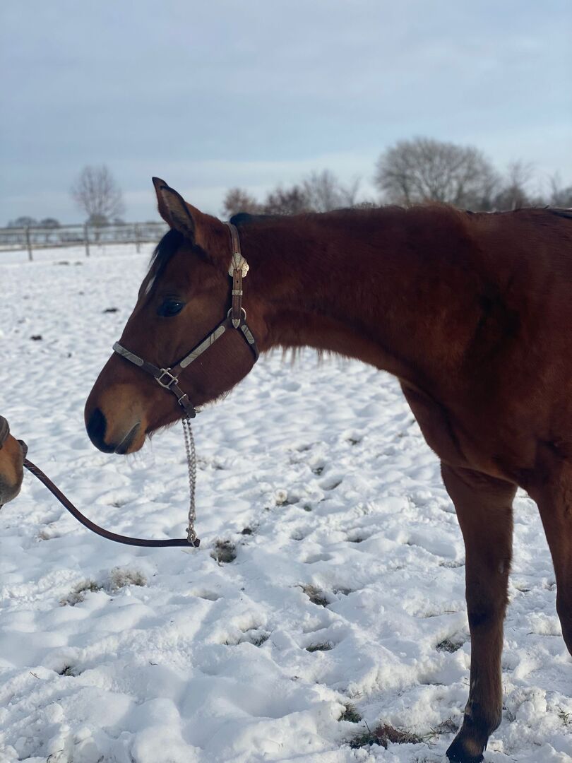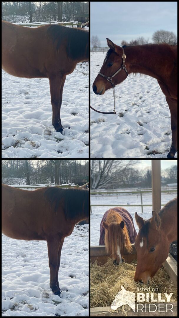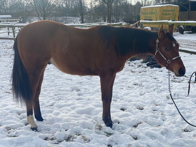 Fantastyczne potomstwo Quarter Horse szuka wspierającego domu - Lokalizacja: 27383 Scheeßel Kruzinonagreenline, wałach rasy Quarter Horse, urodzony 23.05.2024, w kolorze Bay, o szacowanym ostatecznym wzroście ok. 160 cm, jest pięknym, prawidłowo zbudowanym i bardzo dobrze rozwiniętym młodym wałachem o zrównoważonym umięśnieniu i harmonijnej budowie. Jacob wykazuje płynne, dobre ruchy i ma bardzo dobry wszechstronny i rekreacyjny rodowód, co czyni go idealnym przyszłym koniem sportowym do klas rekreacyjnych i wszechstronnych. (Keep On Crusin x Green With Invy). Ma bardzo miły, zorientowany na ludzi charakter, jest otwarty, ciekawy, uważny, nieskomplikowany i wyjątkowo dobrze wychowany oraz łatwy w codziennej obsłudze. Wałach jest chętny do nauki, utalentowany i nie pozostawia nic do życzenia. Jest grzeczny i chętny do współpracy z kowalem i weterynarzem. Jacob jest zdrowy, 6-panelowy n/n, zaszczepiony i regularnie odrobaczany, a także ma regularne badania krwi. Został wychowany w sposób odpowiedni dla gatunku i jest zaznajomiony z boksami i otwartą stajnią. Jacob opanował kompletne źrebię 1 x 1, jest wyszkolony w halterze i bez problemu jeździ w przyczepie. Ma niewielką bliznę na przedniej nodze, ale nie ma to na niego żadnego wpływu. Jest uprawniony do startów w DQHA Futurity, opłacany jest program EWU dla młodych koni, a jego rodzeństwo odnosi już sukcesy w sporcie wszechstronnym. Z ciężkim sercem przekazujemy go do kochającego i wspierającego domu z powodu jego wycofania się ze sportu jeździeckiego. To wspaniały młody koń z wielkimi perspektywami i najlepszymi warunkami wstępnymi na udaną przyszłość w sporcie.