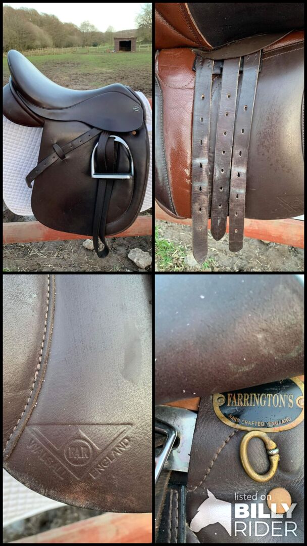 Farringtons dark brown leather saddle 17.5". Comes with stirrups and leathers. Lovely saddle. Great condition and markings. All proceeds from the sale will go to a horse sanctuary