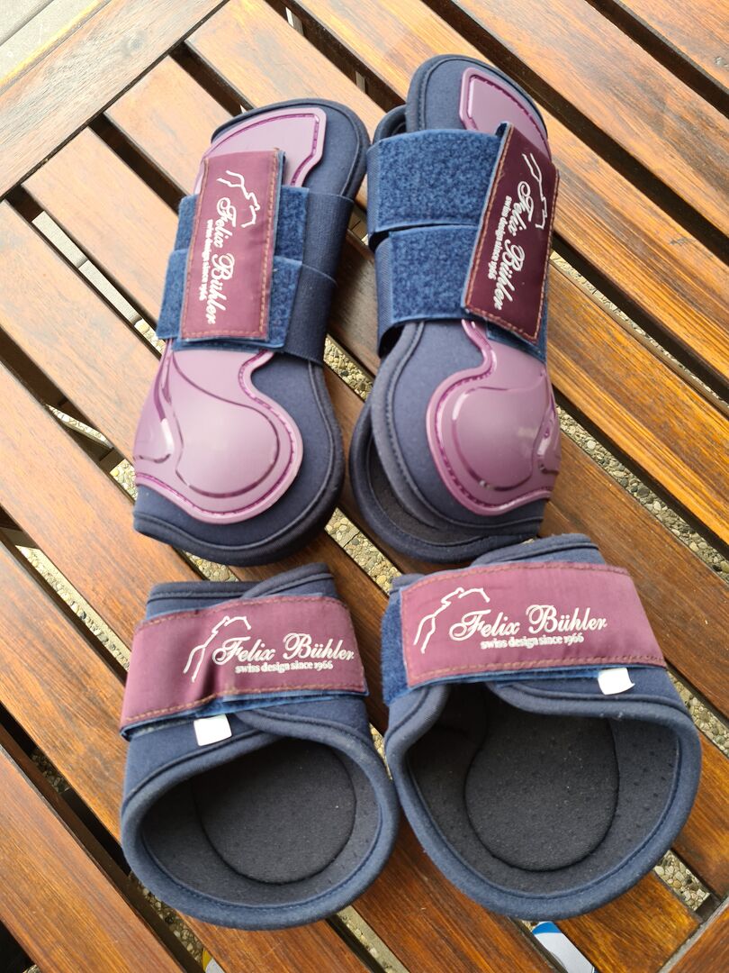 Felix Bühler Gaiters Set X-Full - Zestaw getrów i butów. Kolor oberżyny. Rozmiar Extra Full. Przednie getry w świetnym stanie, spodnie mają kilka śladów otarć. Neopren wewnątrz nieuszkodzony