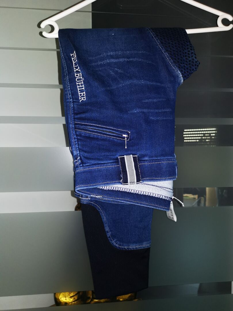 Felix Bühler Jeans Breeches, rozmiar 40 - Bryczesy jeansowe Felix Bühler w rozmiarze 40, z elastyczną nogawką, z kolekcji Equestrian. Bardzo wygodne bryczesy. Niestety, mają one kilka śladów zużycia/jazdy, ale nie ma żadnych wad.