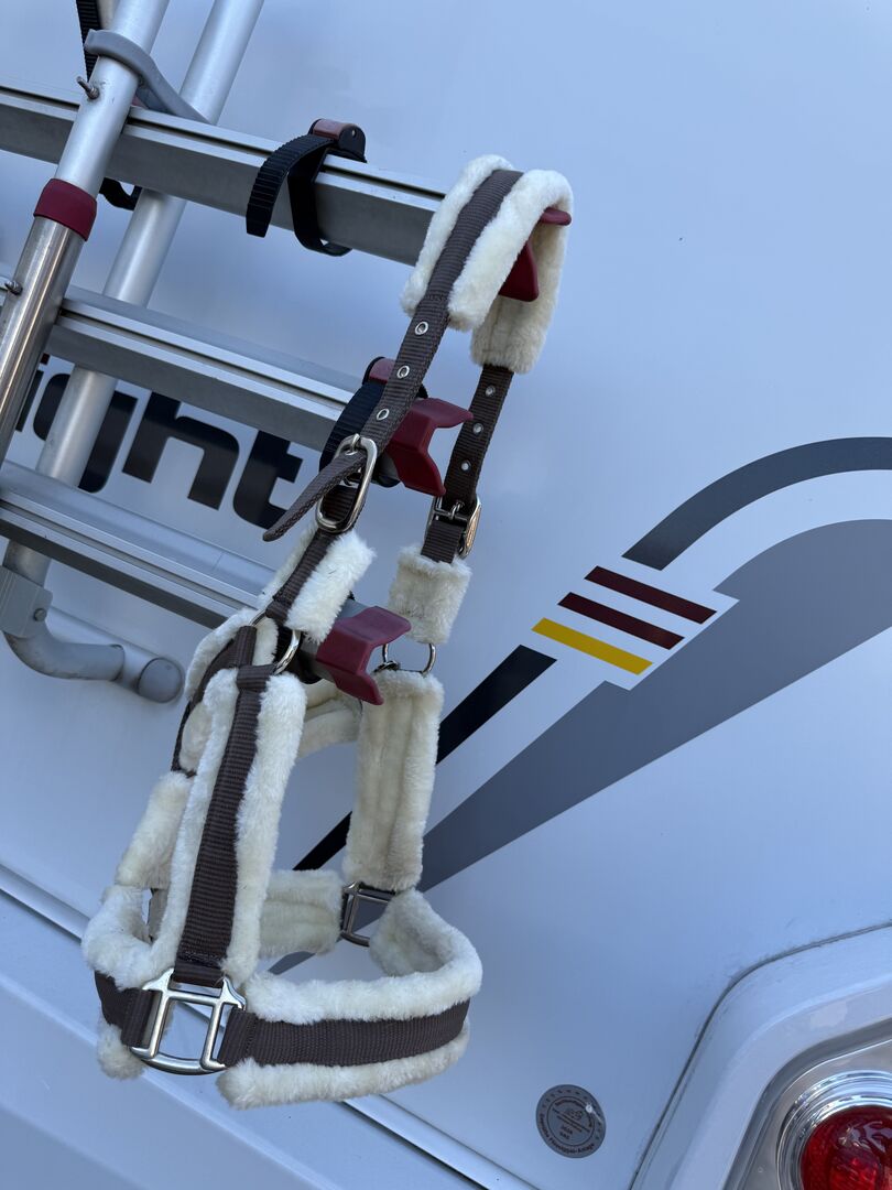 Felix Bühler zestaw podkładka pod siodło-gaiter-halter-maska na muchy - Na sprzedaż jest używany, ale dobrze utrzymany zestaw składający się z: - Podkładka pod siodło ujeżdżeniowe (DR) - pasująca maska na muchę - Getry na tylne nogi - kantar