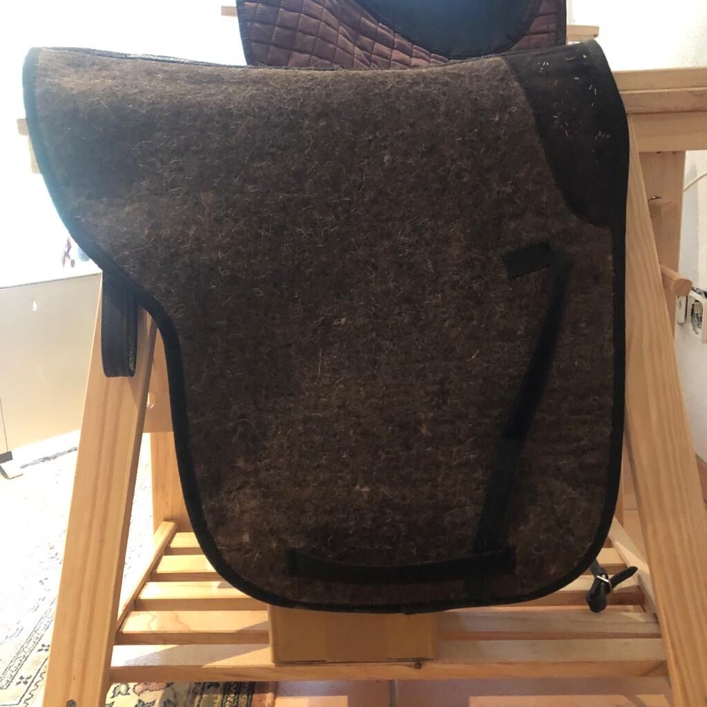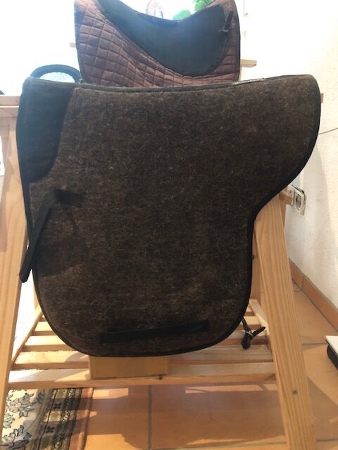Filcowy pokrowiec na siodełko - Filc - podkładka pod siodło Anatomicznie wycięty materiał na siodło Zapięcie na rzep dla regulowanych klap siodła 100% wełna Mało używany, za mały na mojego konia Długość 55 cm Długość boku od szwu środkowego 52,5
