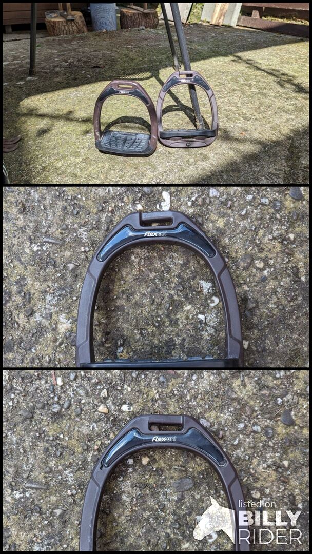 Flex-On Stirrup Green Kompozytowy bieżnik pod kątem - Sprzedam strzemiona Flex-On w kolorze brązowym. Bieżnik jest lekko ścięty. Nowa cena to 179€. Ślady użytkowania widoczne na zdjęciach.