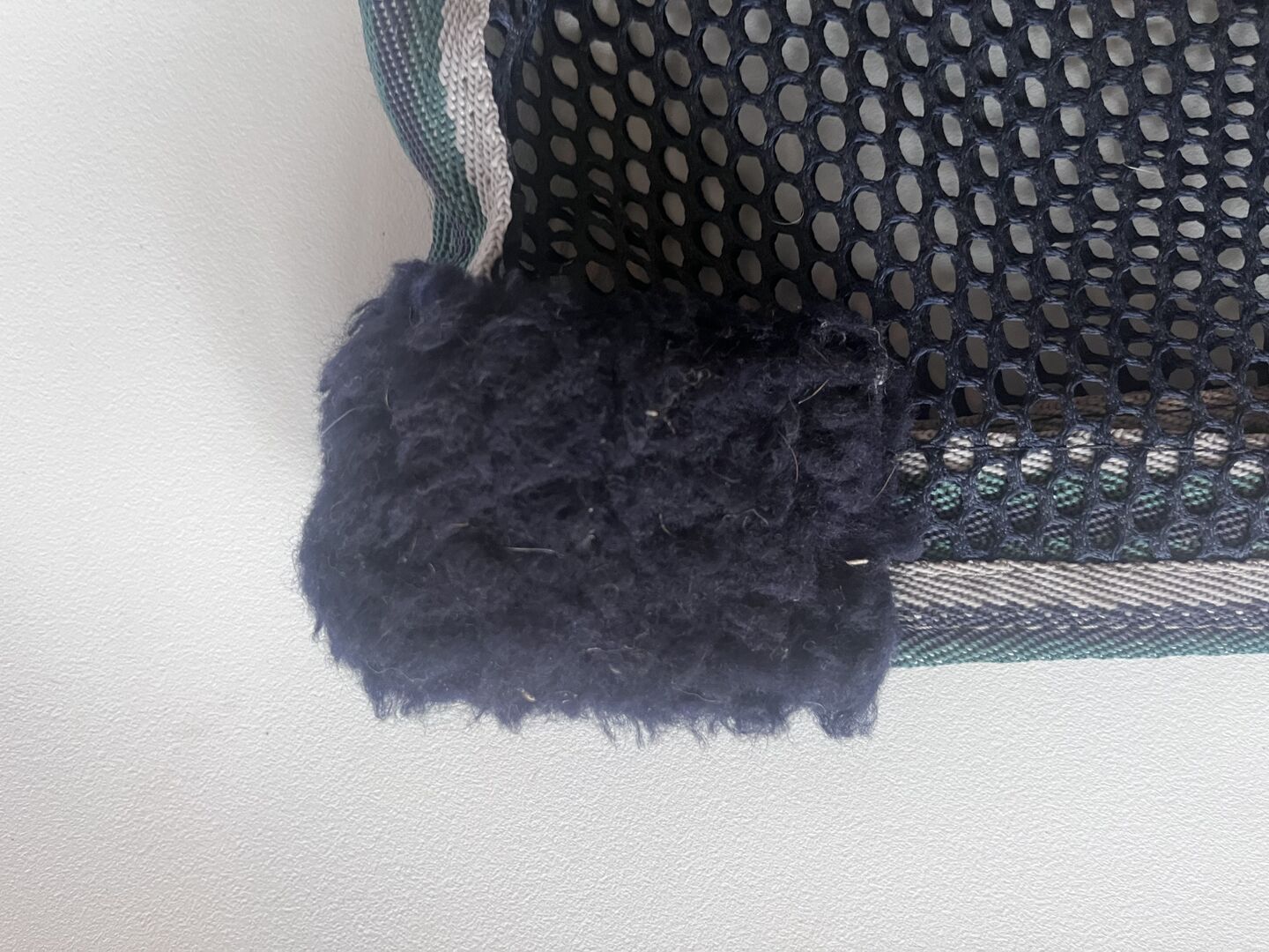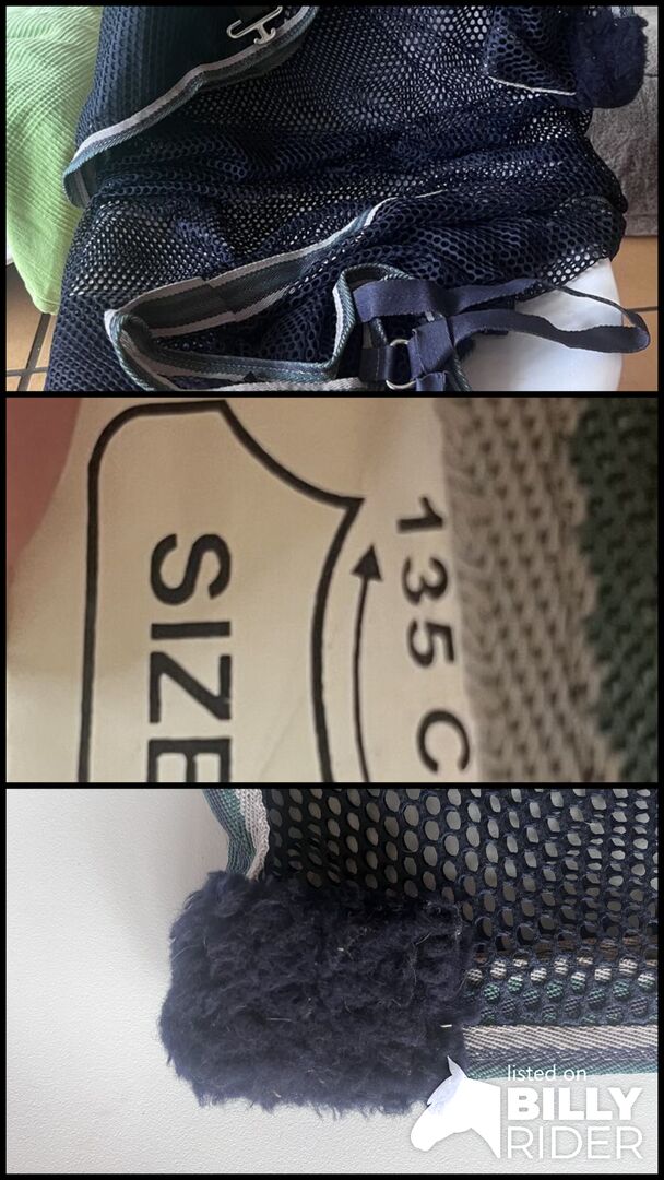 Flyblanket - Dywanik w kolorze ciemnoniebieskim z zielono-szarym wykończeniem. Rozmiar 135 cm. Położony na andaluzyjskim.