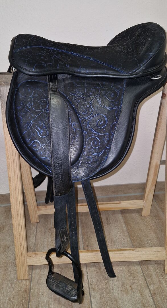 Freeform Junior XSB 16,5 cala - Piękny model Freeform Junior. Czarny z niebieskimi zdobieniami. Podstawa XSB z wycięciem 9 cm Część siedziska ROL 16,5 Skóra nubukowa Zawiera strzemiona