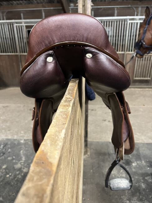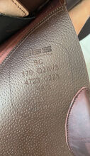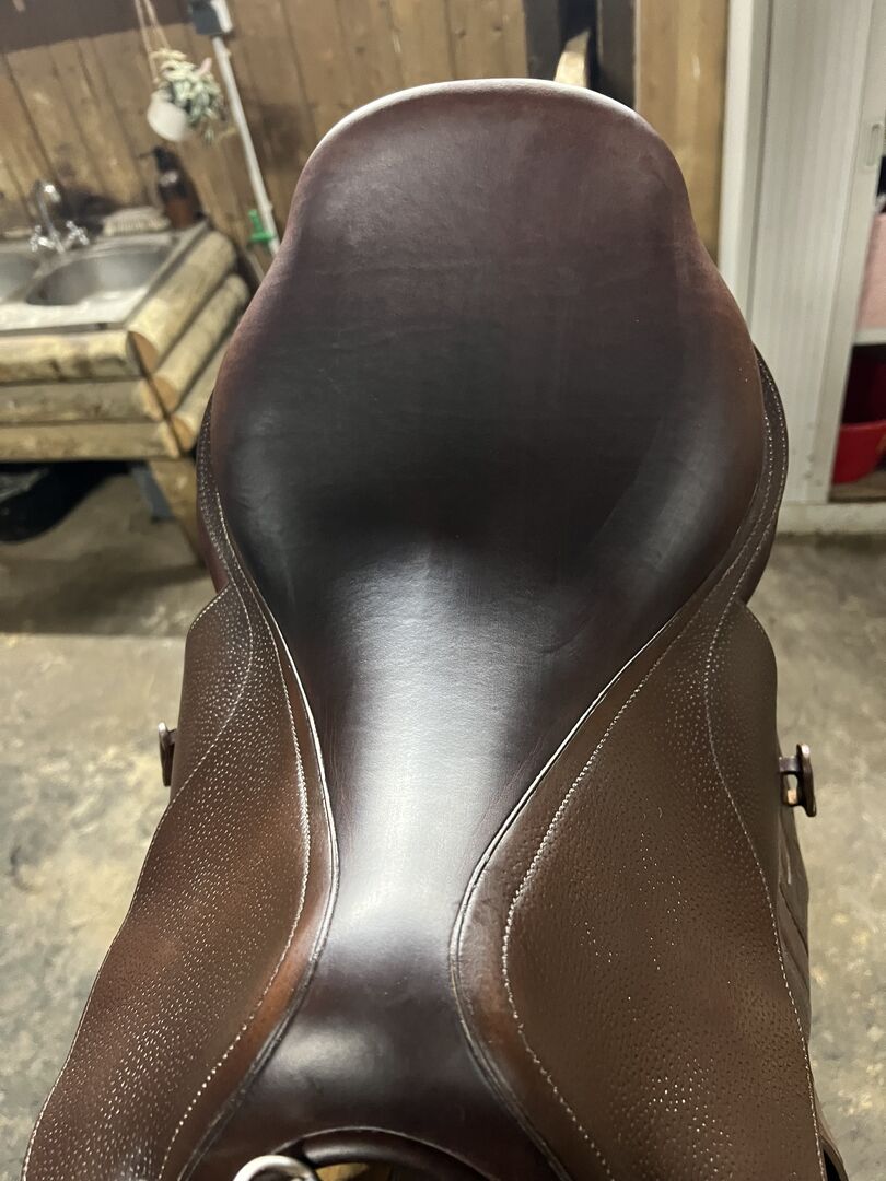 Znakomite siodło semi-hollow GBS, model 2023, z brązowej skóry.Rozmiar 17 cali, kwatera 2AV3.Eleganckie wykończenie z lakierowaną tylną falbaną i strzemionami w kolorze mocca.