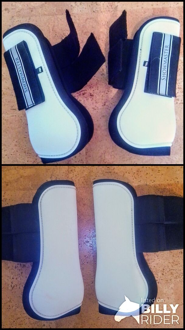 Getry z twardej skorupy białe - Sprzedam mało używane twarde buty w kolorze białym, rozmiar: F (warmblood), wewnętrzna wyściółka wykonana z miękkiej gumy chloroprenowej, 2 szerokie gumki z zapięciem na rzep, wysyłka tylko jako ubezpieczona paczka, zapytaj o koszty.
