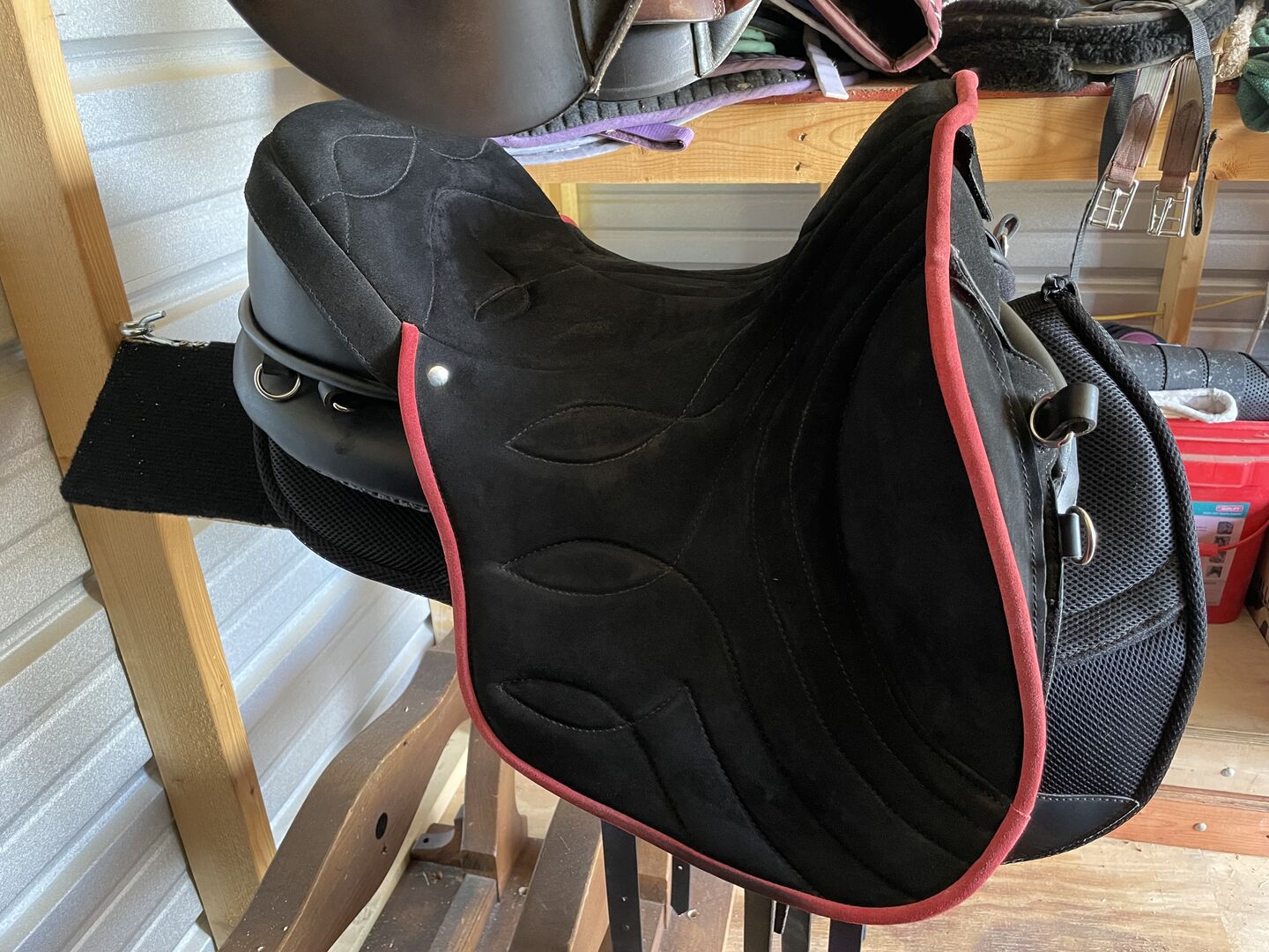Ghost Buttera size grande. Black with red piping. Lorica. Very comfortable and secure treeless saddle made in Italy. Nearly everything on the saddle is adjustable. Comes with ghost pad and all shims that I have.