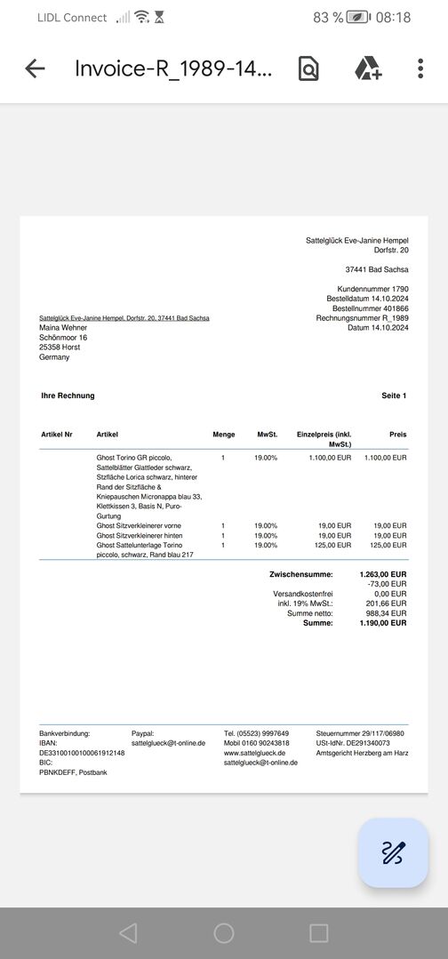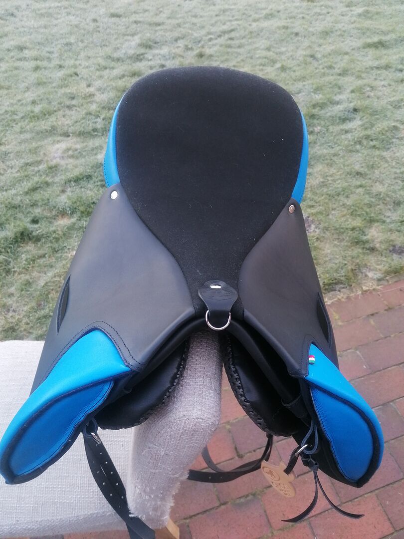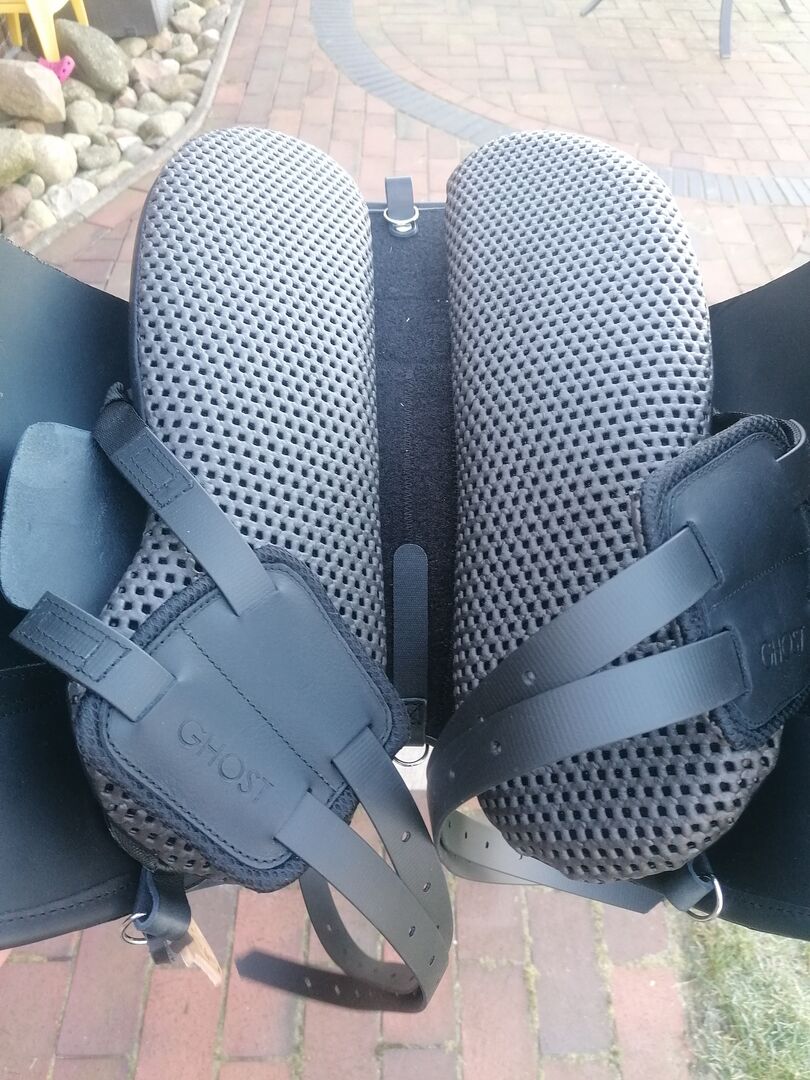 Ghost Saddle Torino Piccolo NOWOŚĆ - Nowy Ghost Torino Piccolo z podkładką pod siodło Materiały patrz zdjęcie faktury Siodło było założone tylko raz na mojego konia. Niestety nie pasuje na moją klacz. Na życzenie chętnie dodam reduktory siedziska. Nowa cena 1190 euro