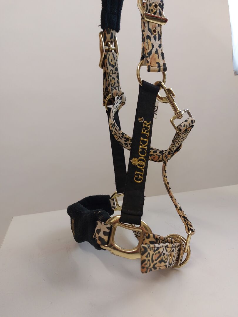 Gloöckler Halter Leo Pattern - Nowy halter w lamparci wzór od Gloöckler, jeśli szukasz prawdziwego przyciągacza wzroku, skontaktuj się z nami! Złote klamerki i polar na uszach i nosie.