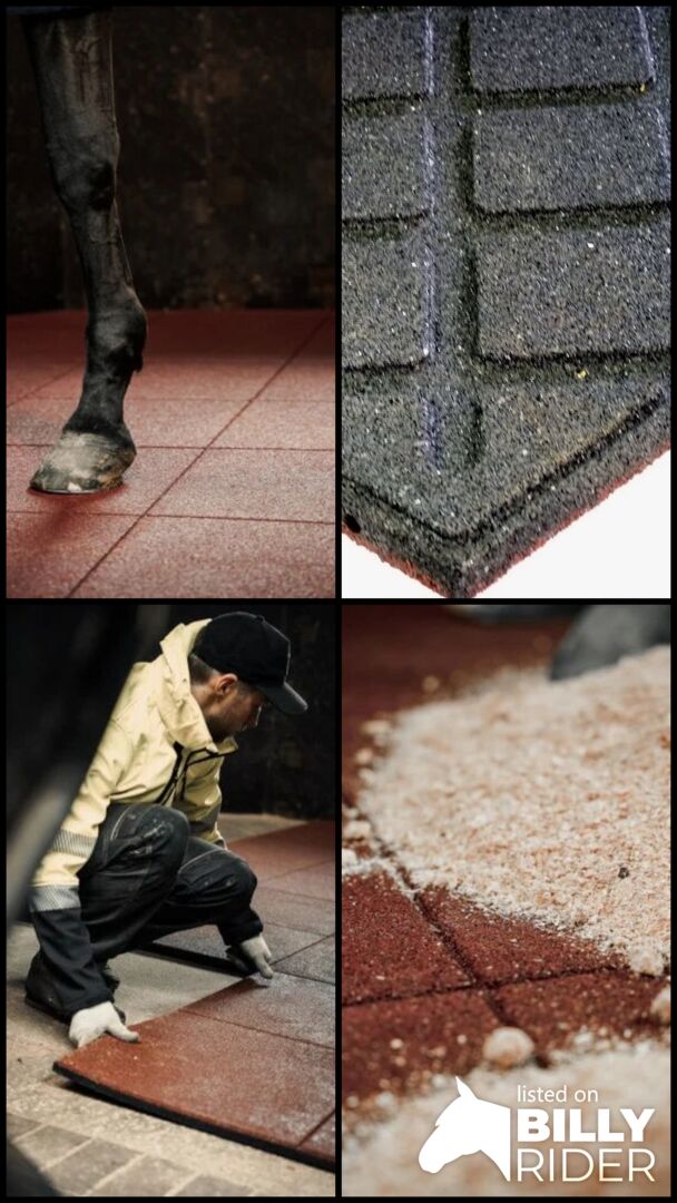 TOPSELLER Większa gęstość dla większej trwałości Idealna do użytku na zewnątrz antypoślizgowa i pochłaniająca hałas Tłoczony granulat gumowy w kolorze czerwonym/brązowym - spód czarny Łatwe układanie dzięki kołkom systemowym (w cenie) Można po niej jeździć Wyprodukowano w Europie przepuszczalna dla wody Instalacja: Zalecamy solidną podstawę z betonu, kostki brukowej lub struktury żwiru i wiórów! Powierzchnię można oczywiście również ustabilizować za pomocą naszych płyt padokowych. Lekkie nachylenie i odpływ w naturalny sposób sprzyjają odpowiedniemu odprowadzaniu moczu i wody, a boczne drewno katodowe (lub podobne) zapobiega poślizgnięciom.