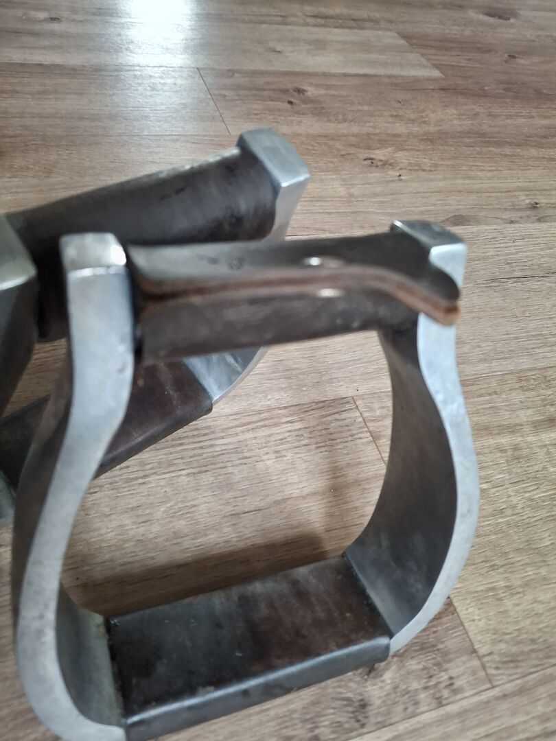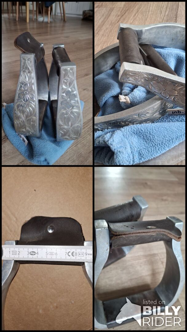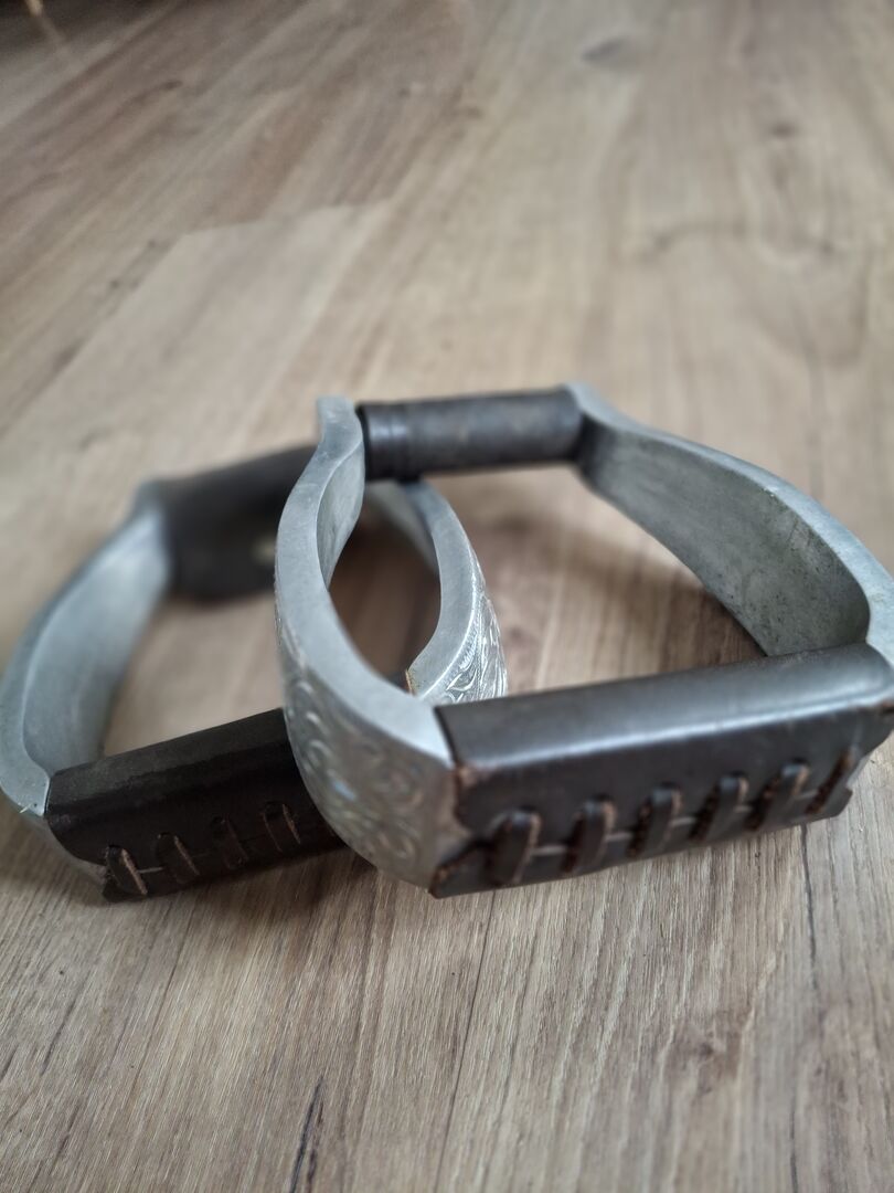 Grawerowane strzemiona westernowe - Na sprzedaż piękne westernowe strzemiona z grawerem, aluminium/ciemny brąz. Mało używane, minimalne ślady użytkowania.