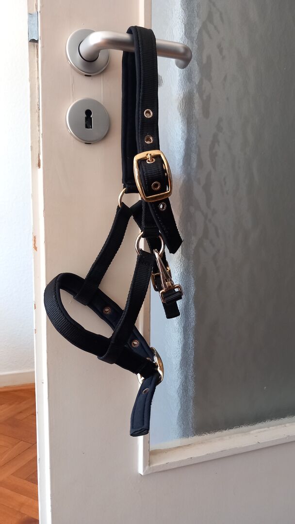 Halter dla źrebiąt - Kantar jest bardzo prosty, pasek na szyję jest lekko wyściełany. Jest w rozmiarze źrebięcym, ale nadal pasuje na naszą mini Shetty.