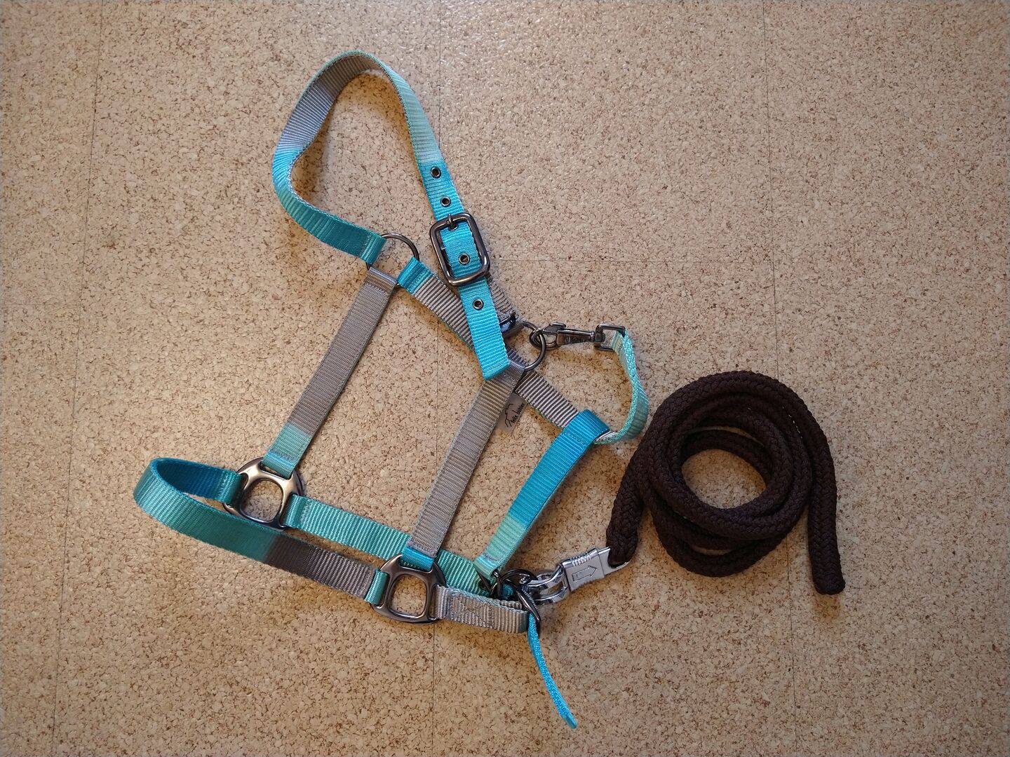 Halter Felix Bühler Full Rainbow brązowy, niebieski, zielony + ciemnobrązowa linka z hakami antypanicznymi